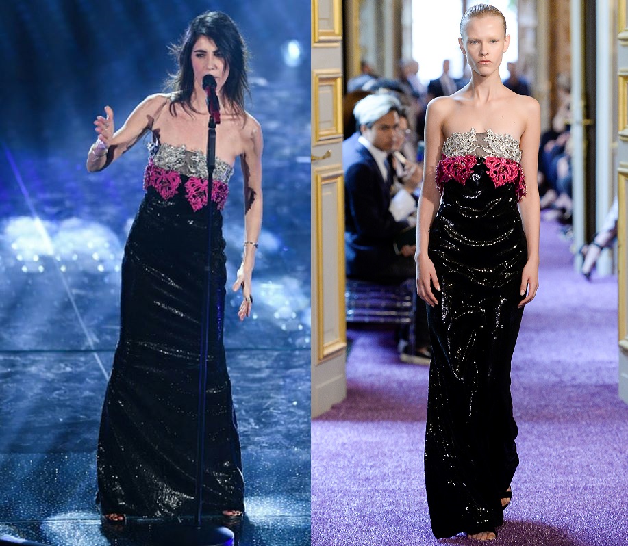 Tra le ospiti, Giorgia ha catalizzato l’attenzione non solo per via della voce incredibile che ha fatto letteralmente impallidire i cantanti in gara ma anche per l’abito, a colonna, nero e con decorazioni fucsia e argento. Una creazione firmata Francesco Scognamiglio della collezione Autunno-Inverno 2016-17 haute couture. Altro meraviglioso abito, questa volta Giorgio Armani, per l’attrice Sveva Alviti, sul palco dell’Ariston per presentare il film Dalida.