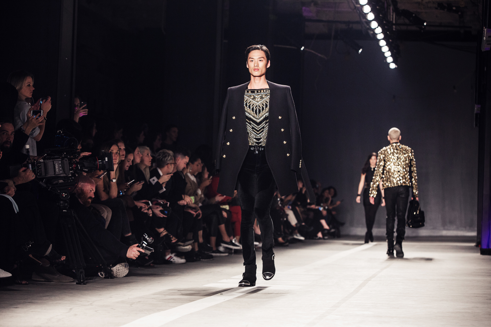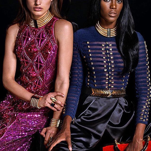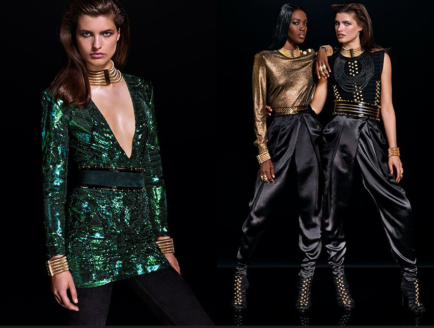 Per Rousteing, è stato fondamentale che la produzione degli abiti non siano state semplicemente copie dei suoi fiori all’occhiello. Ha voluto mostrare i diversi lati di Balmain, non solo gli abiti impreziositi, ma anche la sartoria, le sagome di grandi dimensioni, il drappeggio e la femminilità parigina. Ma è fuor di dubbio che la collezione si rifaccia moltissimo al lavoro di Olivier per Balmain; i vestiti a trama fitta, gli abiti di paillettes e pietre incastonate color smeraldo, i miniabiti di perline, i pantaloni drappeggiati, e le giacche dalle spalle grosse, le minigonne drappeggiate e gli stivali a metà coscia, opulenza ed eccessi in stile fine anni ’80. Dò la mia preferenza agli abiti disegnati per l’uomo, più semplici e quindi più facilmente indossabili, molto bello un cappotto verde militare, un giaccone marinaio blu, e una giacca smoking con inserti militari.