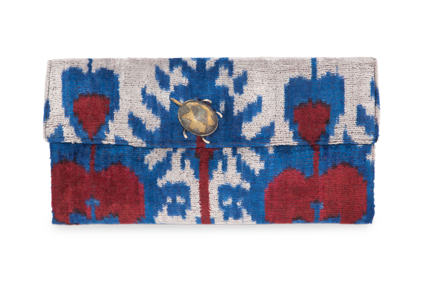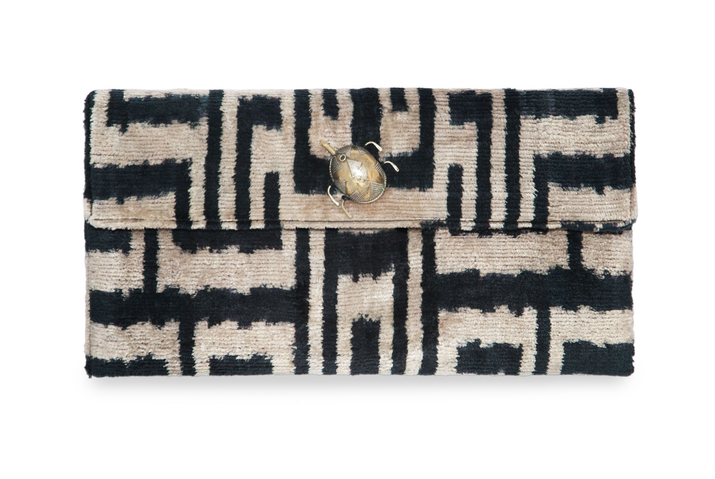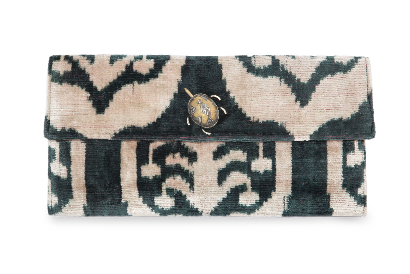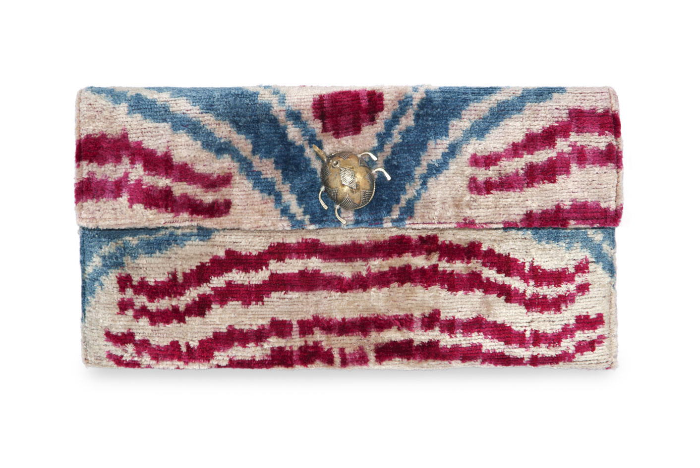 La Bizantina bag è una rivisitazione in chiave contemporanea di una pochette della di Camerino, con misure più grandi (sono lunghe 30 cm), l’esterno è un Ikat di velluto in seta tessuto con antichi telai di Bukhara (Uzbekistan), i pattern sono diversi per ogni borsa e tutte le borse hanno un etichetta ricamata con logo e numero, infatti ogni Bizantina bag è unica e irripetibile, l’ interno è in satin colorato, e sono tutte cucite a mano in Italia. Il fermaglio in ottone e argento ha la forma di una tartaruga, è fatto a mano ad Istanbul ed è ripreso da un antico disegno ottomano.