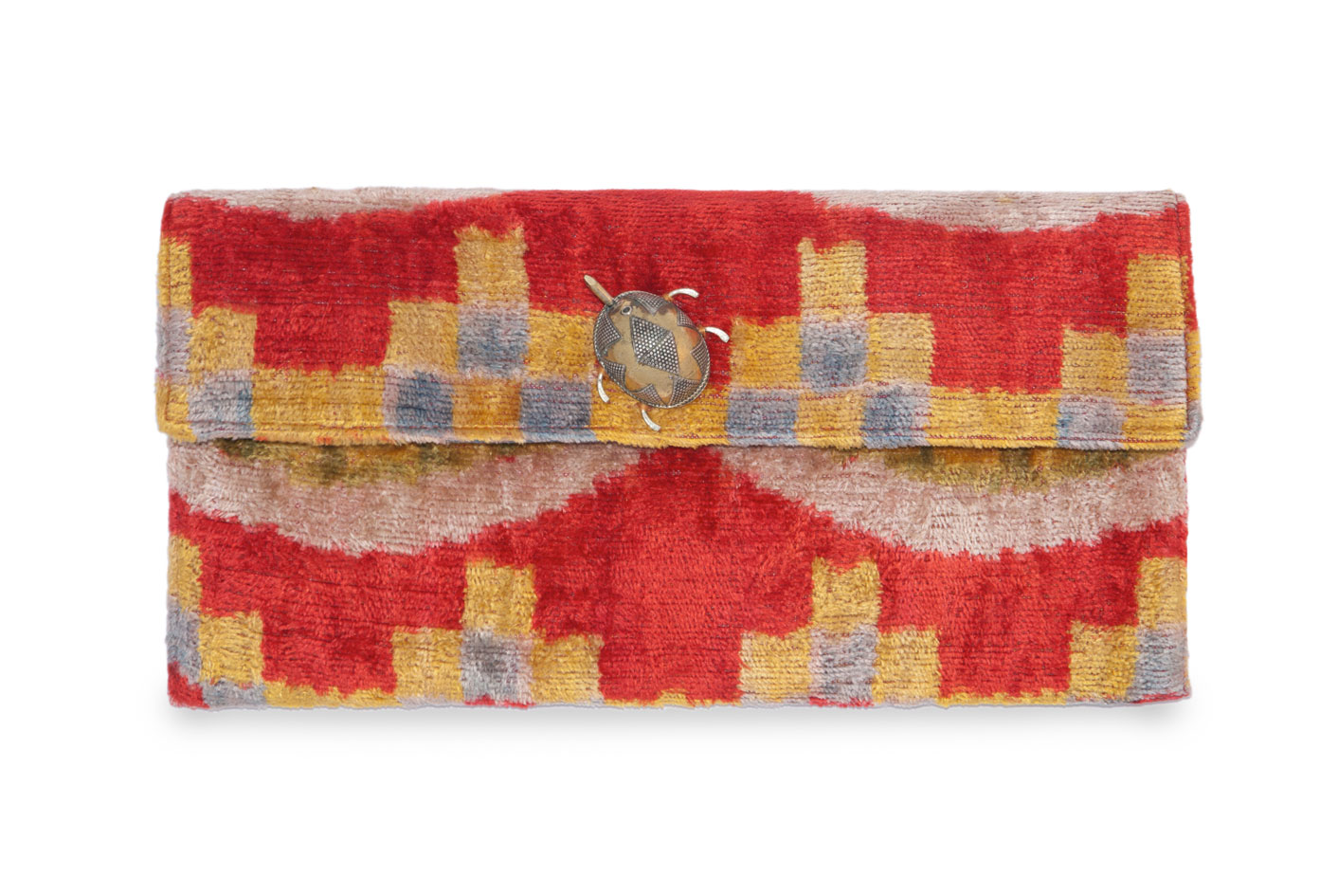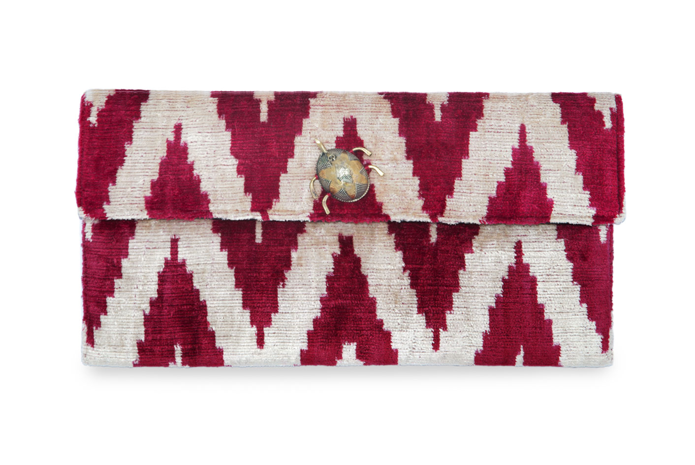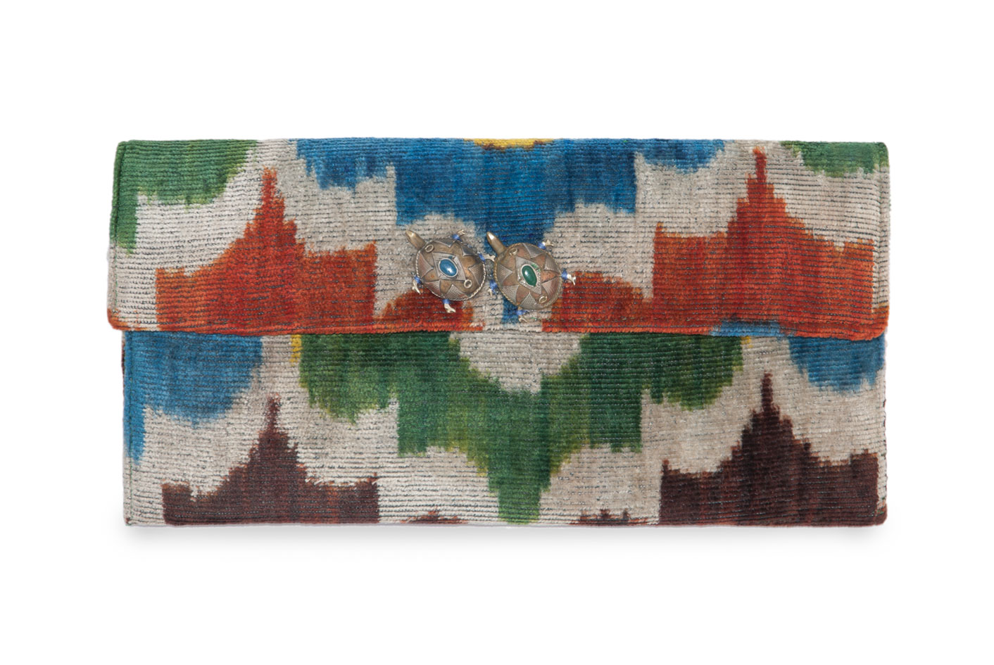 La Bizantina bag è una rivisitazione in chiave contemporanea di una pochette della di Camerino, con misure più grandi (sono lunghe 30 cm), l’esterno è un Ikat di velluto in seta tessuto con antichi telai di Bukhara (Uzbekistan), i pattern sono diversi per ogni borsa e tutte le borse hanno un etichetta ricamata con logo e numero, infatti ogni Bizantina bag è unica e irripetibile, l’ interno è in satin colorato, e sono tutte cucite a mano in Italia. Il fermaglio in ottone e argento ha la forma di una tartaruga, è fatto a mano ad Istanbul ed è ripreso da un antico disegno ottomano.