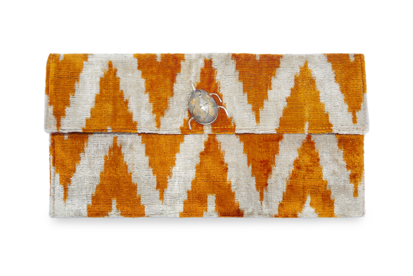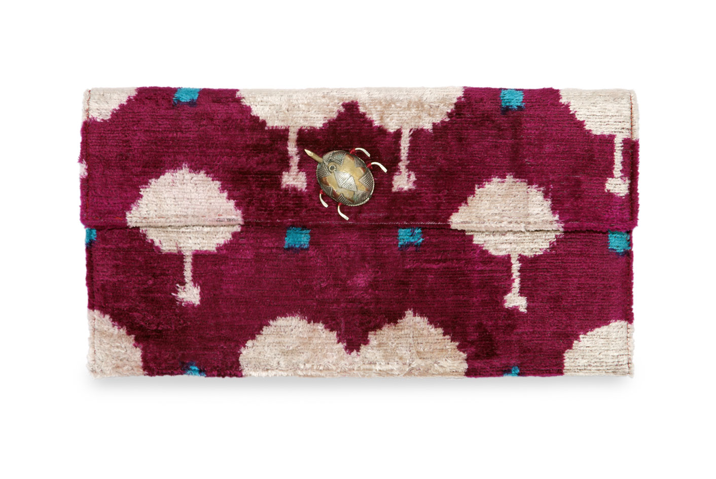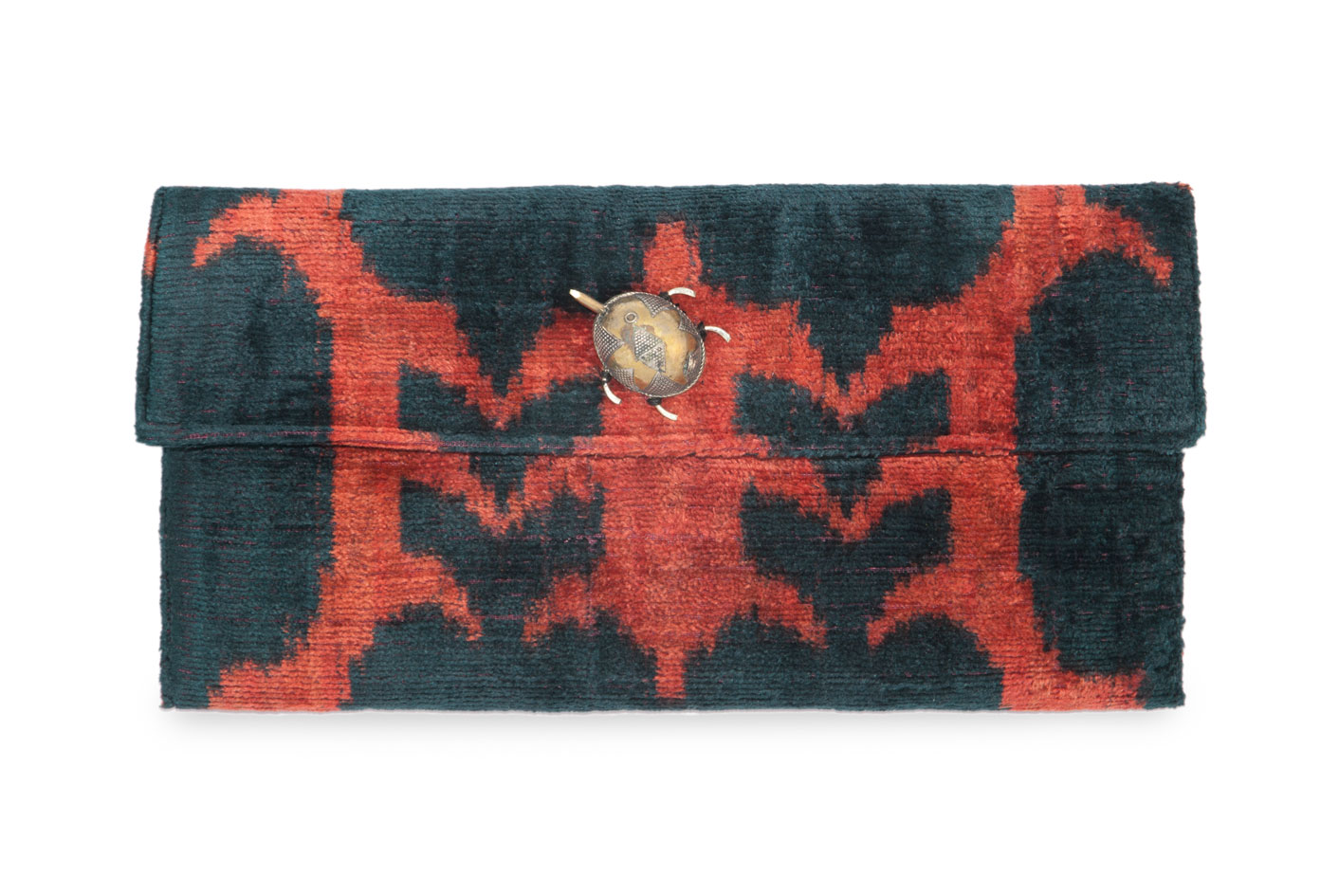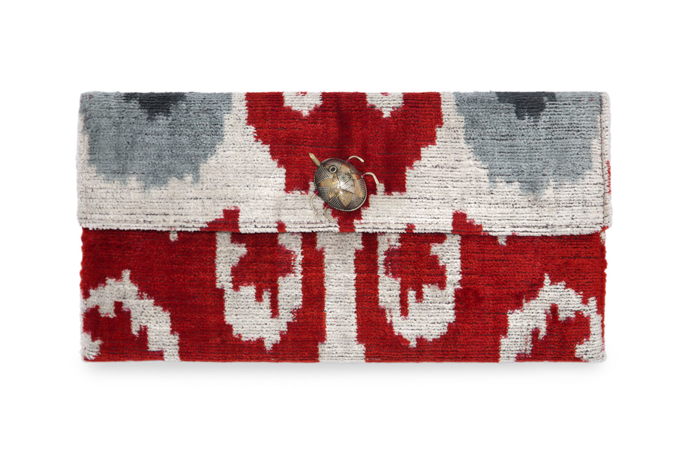 La Bizantina bag è una rivisitazione in chiave contemporanea di una pochette della di Camerino, con misure più grandi (sono lunghe 30 cm), l’esterno è un Ikat di velluto in seta tessuto con antichi telai di Bukhara (Uzbekistan), i pattern sono diversi per ogni borsa e tutte le borse hanno un etichetta ricamata con logo e numero, infatti ogni Bizantina bag è unica e irripetibile, l’ interno è in satin colorato, e sono tutte cucite a mano in Italia. Il fermaglio in ottone e argento ha la forma di una tartaruga, è fatto a mano ad Istanbul ed è ripreso da un antico disegno ottomano.