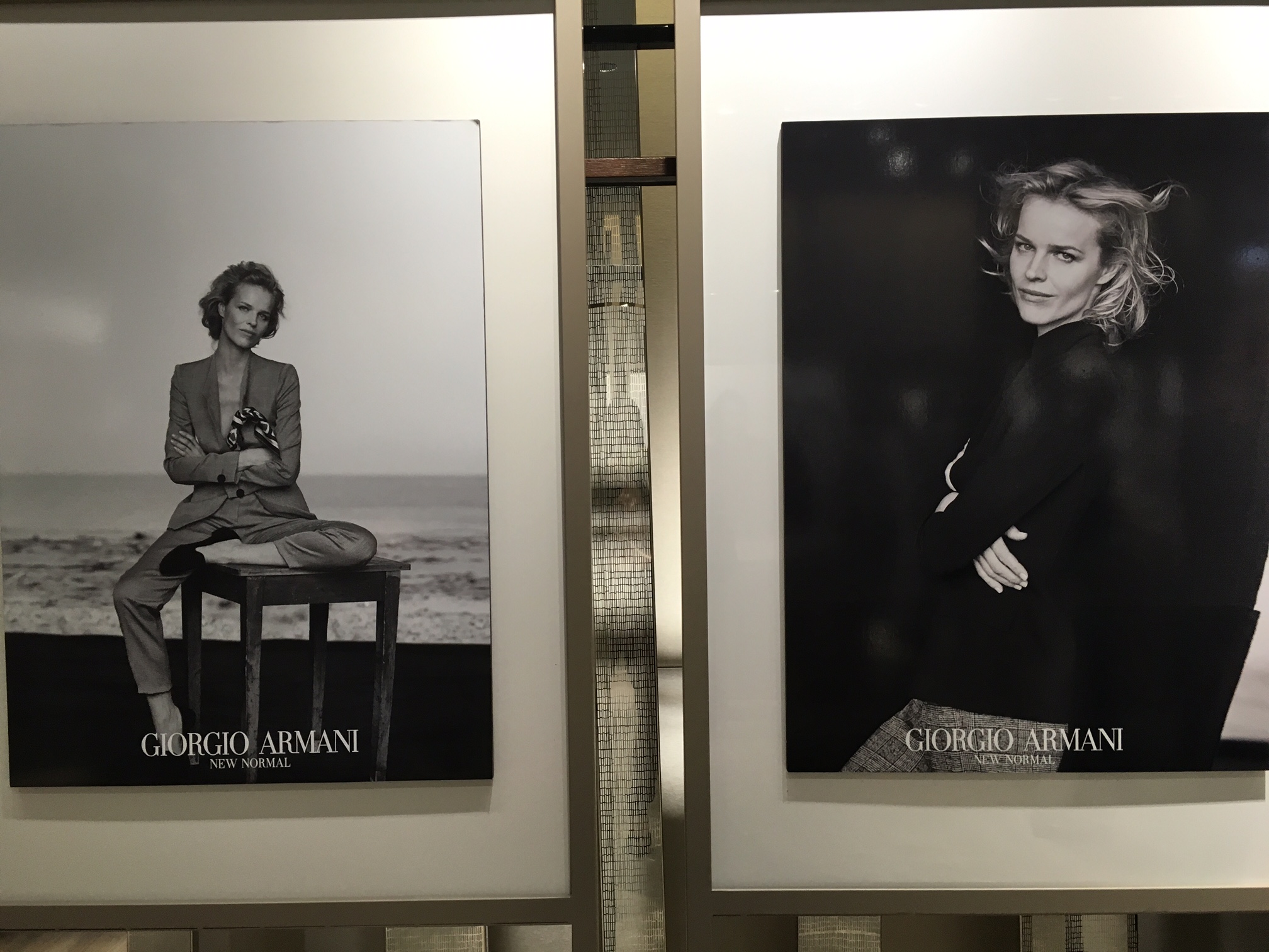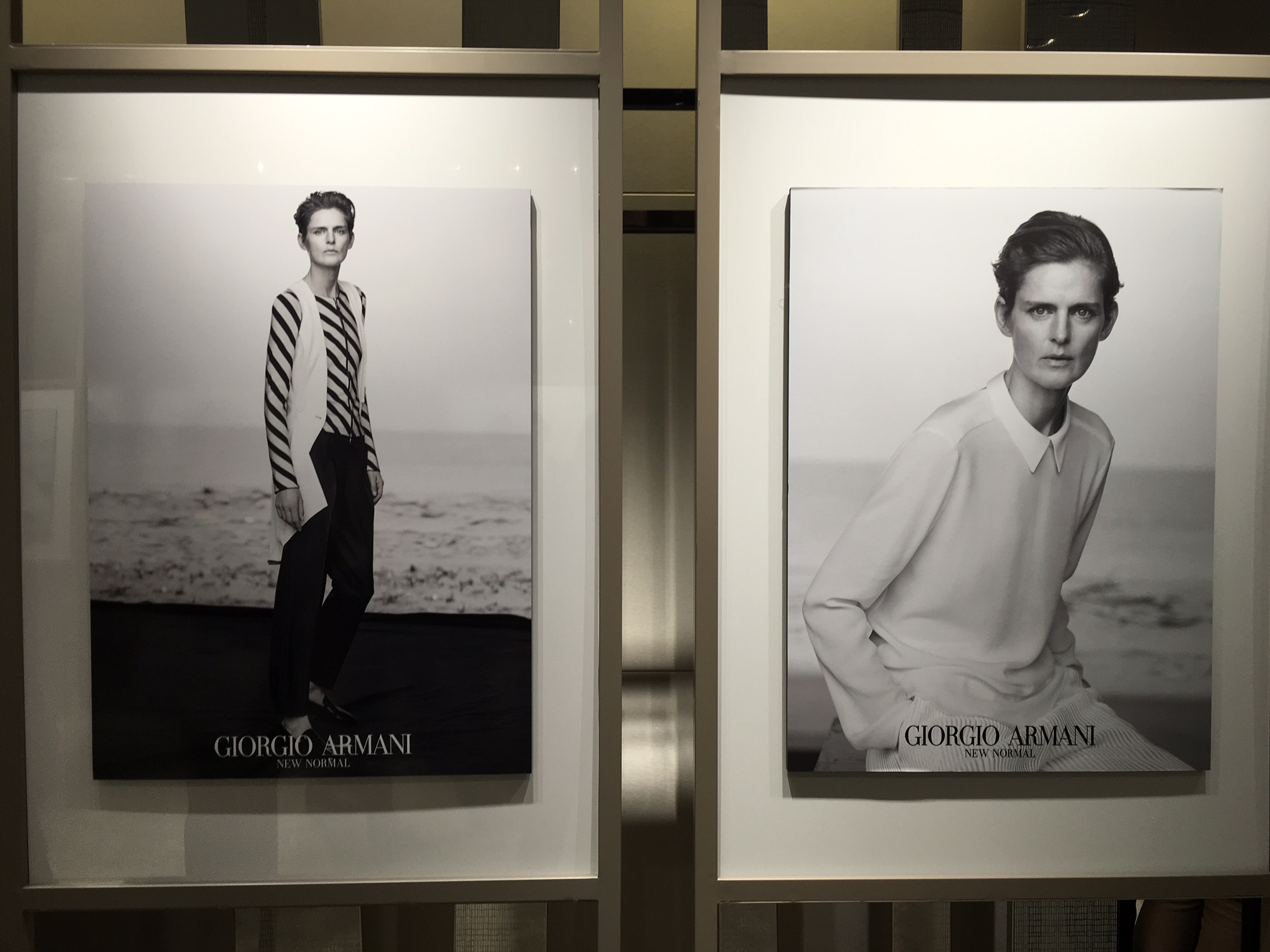 In mostra anche gli scatti di Peter Lindbergh per la campagna Spring/Summer 2016 New Normal. Ritratti di quattro super-modelle, ma anche donne autentiche: Nadja Auermann, Stella Tennant, Yasmin Le Bon ed Eva Herzigova si mostrano per quello che sono oggi: donne affascinanti, trucco invisibile e senza artifici. Proprio come la nuova collezione è un distillato senza tempo dello stile Armani, queste donne dimostrano che la vera bellezza non ha età, i capi esposti sono l’ideale per la vita di tutti i giorni e mai eccessivi. Giorgio Armani dice che per questa campagna, ha voluto quattro donne iconiche di forte personalità e ha scelto Peter Lindbergh, con il quale ha collaborato più volte, perché le sue fotografie sono vere e mostrano la vita reale. Stesso senso della realtà che Armani ha voluto trasmettere con gli abiti che offrono l’eleganza naturale e la normalità della vita di tutti i giorni.
