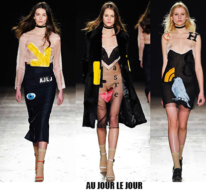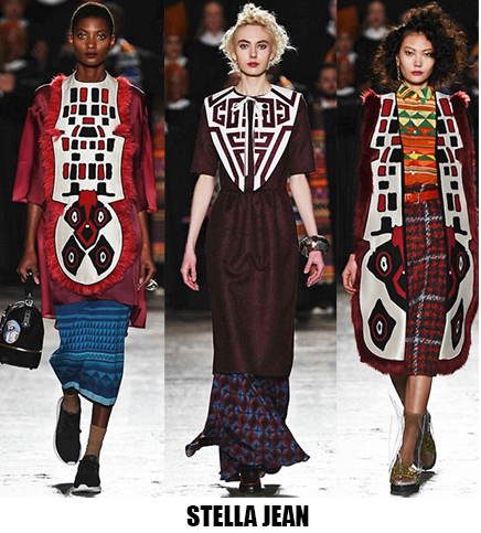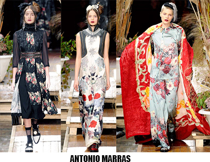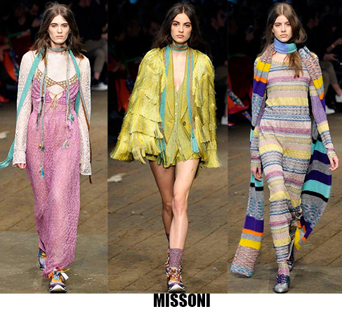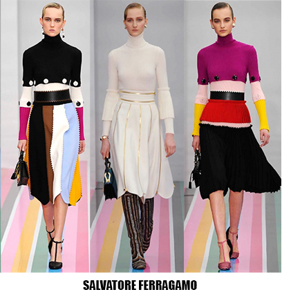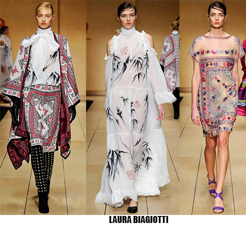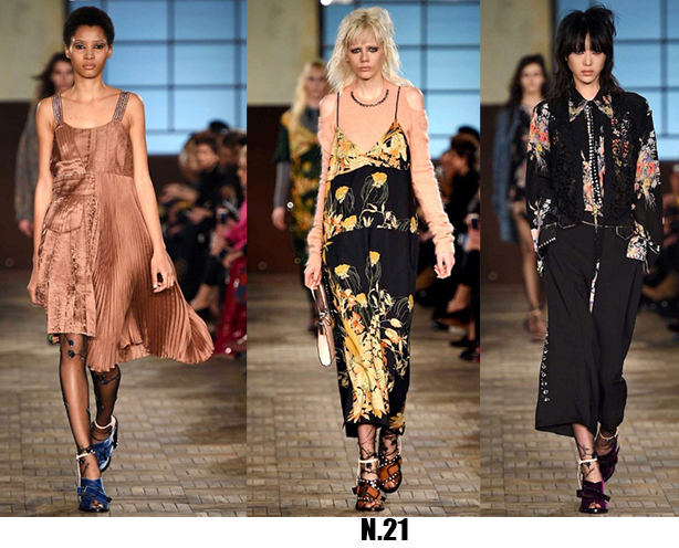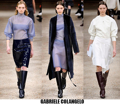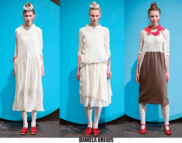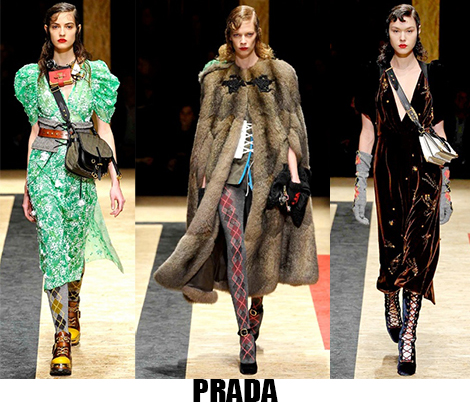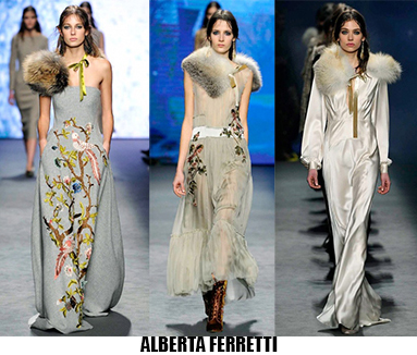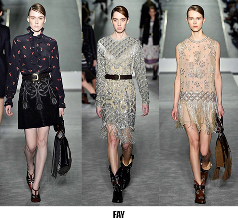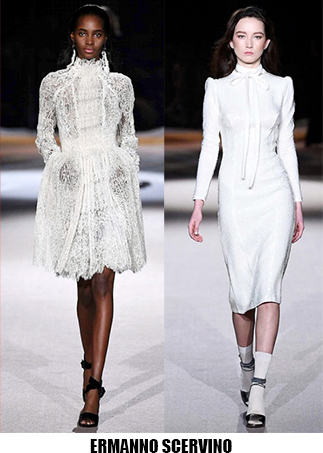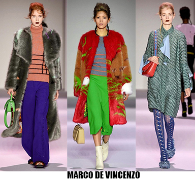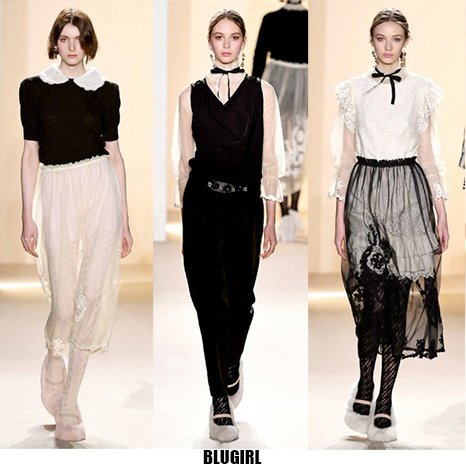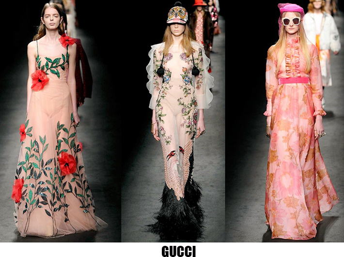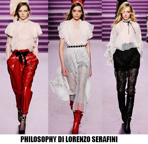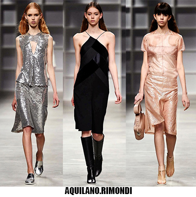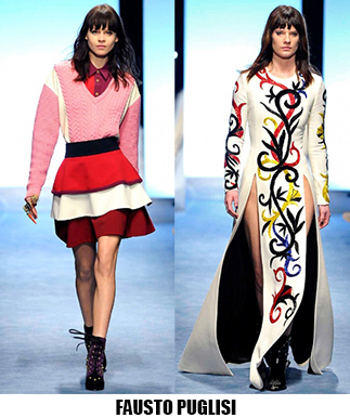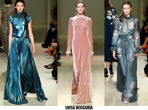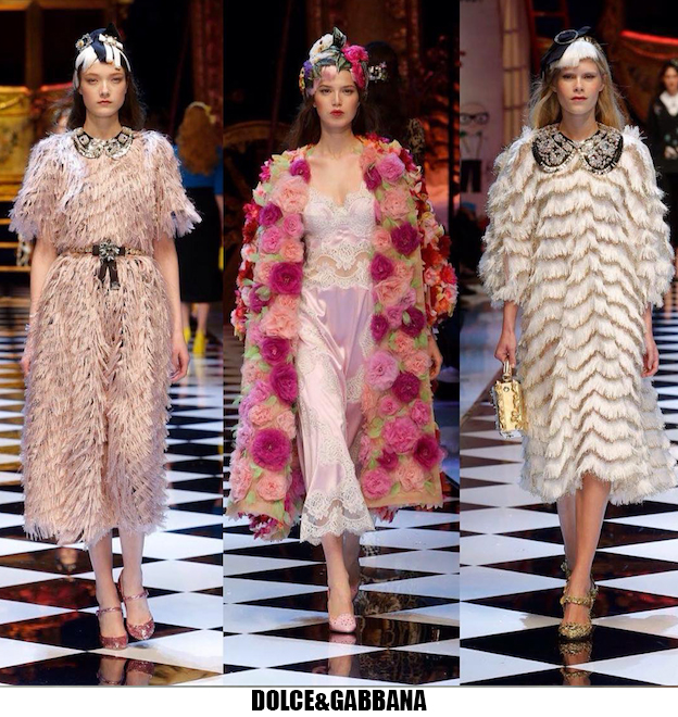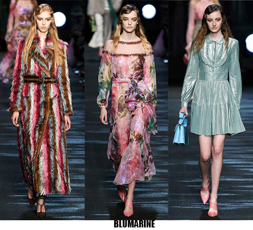 Alessandro Michele non ha bisogno di effetti speciali e fuochi d’artificio per catturare l’attenzione sugli abiti che disegna per Gucci, ormai a distanza di un anno dalla sua nomina a direttore creativo, si può dire che ha creato un’estetica trascinante, il suo stile influenza molti designer così com’è stato per Maria Grazia Chiuri e Pier Paolo Piccioli che dal 2007 hanno creato un trend Valentino. Sulla scia di Gucci e di Valentino prende spunti Vivetta, che dai colletti particolarissimi di qualche stagione fa, perde in originalità restando però fedele al suo mood fresco e naive. Le ragazze romantic/rebel di Giamba oscillano tra il pop e il romantico mixando elementi delicati come chiffon e perline con pelle e borchie punk. Restando su un’estetica fiabesca Dolce&Gabbana progettano l’intera collezione ispirandosi a personaggi delle favole, ci sono Cenerentole, Biancaneve, Alice nel paese delle meraviglie, e anche eroine moderne come Frozen che incantano chi le guarda avanzare nei loro abiti luccicanti. Super femminili le donne di Blumarine e le ragazze di Blugirl, il dna lezioso di Anna Molinari si stempera e non eccede, le pellicce colorate riescono ad essere anche grintose, i toni pastello su chiffon seta e laminati vestono bambole romantiche, mentre per Blugirl la prevalenza è di bianco e nero, gonne di tulle trasparenti sono indossate su camicie dal collo vittoriano.