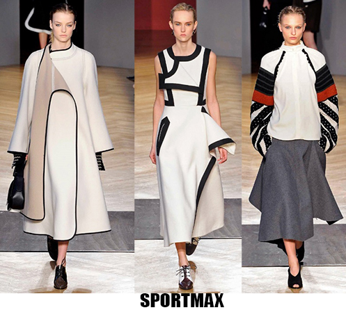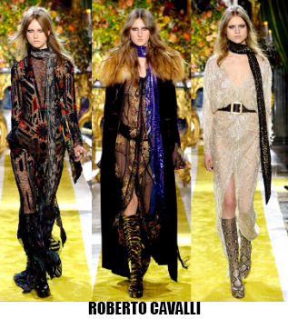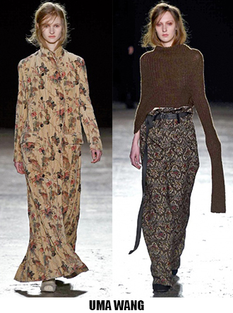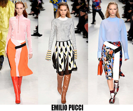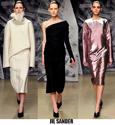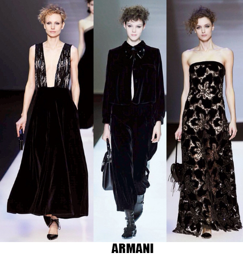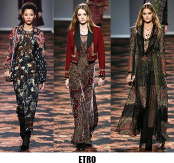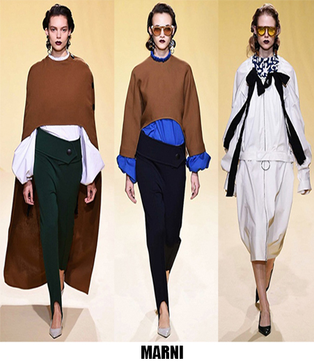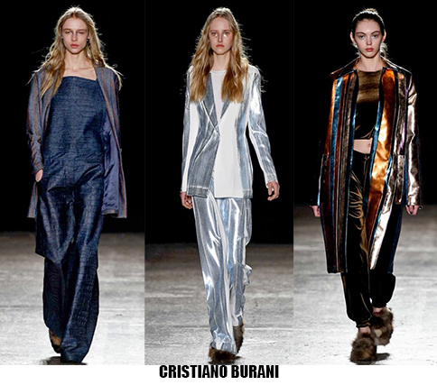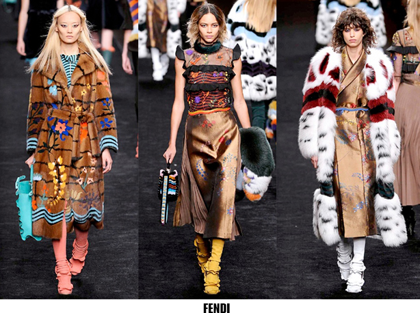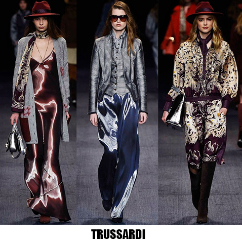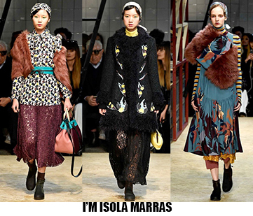 La donna è leziosa, ma con toni più caldi anche da Luisa Beccaria, che con velluti e sete crea abiti lunghi, e vestaglie eleganti che segnano il punto vita. Travolta dall’ondata di romanticismo anche Alberta Ferretti, il suo è un romanticismo retrò, quasi art nouveau, fa indossare stole di pelliccia su abiti e tute in seta beige o pistacchio con intarsi in pizzo. Sulla carrozza della Ferretti viaggia anche Lorenzo Serafini che per Philosophy propone un romanticismo anni ’80, un new romantic interpretato da camicie di musseline con rouches e colli alla Pierrot, pantaloni di pelle rossa o gonne di nappa nera dalle forme morbide a tulipano. Da quest’onda romantica deraglia invece Fendi, che cavalca l’onda del decoro ondulato, ok sembra un gioco di parole, ma sono proprio le onde ad ispirare Karl Lagerfeld che per questa collezione fa ondeggiare colli, maniche stivali e borse. Prada convoglia tutto ciò che le viene in mente in questa collezione, ci sono quindi cappe di pelliccia, cappotti militari, gonne a ruota, maniche importanti e silhouette anni ‘40, cappelli da marinaio, tubini di velluto, ampie cinture-corsetto, un casino estetico che però affascina e non annoia. Per i fedeli dello stile bohémien, Etro ci rassicura con tessuti stampati paisley e floreali, velluti e chiffon, toni caldi e avvolgenti, mentre più glam e meno boho è lo stile che Peter Dundas sceglie per Roberto Cavalli, prendendo spunto dagli anni ’20 e ’60, questa è la collezione e il linguaggio giusto per il brand fiorentino. Ci sono poi stili che non ricevono contaminazioni, restano negli anni fedeli alla loro linea, e di questo rigore è dotato Giorgio Armani, che non si fa influenzare da trend e volant del momento, ma disegna forme androgine, impreziosite da velluti e merletti con prevalenza di total black. Sulla scia del rigore anche Ports 1961, ispirato al guardaroba maschile e Agnona, più femminile, ma senza orpelli. Minimalismo poetico e destrutturato per Damir Doma in contrasto col massimalismo e l’iper-decoro visto in prevalenza a Milano. Giochi di linee e colore da Salvatore Ferragamo mentre Missoni gioca col colore sì, ma laminato, Marni punta sulle forme creando asimmetrie insolite.