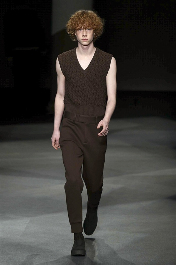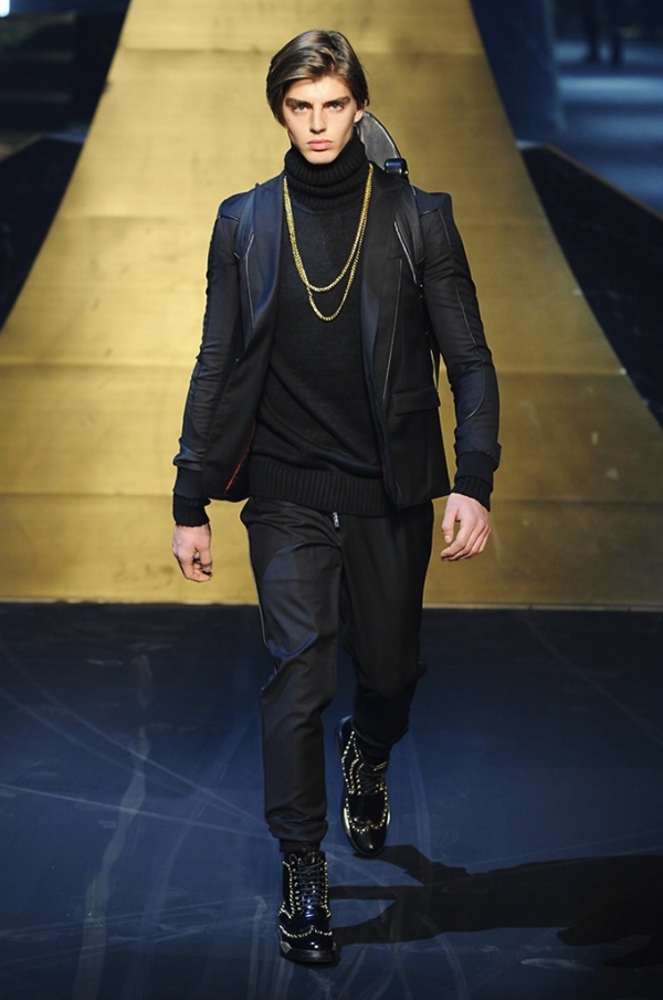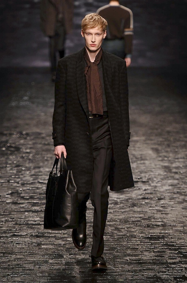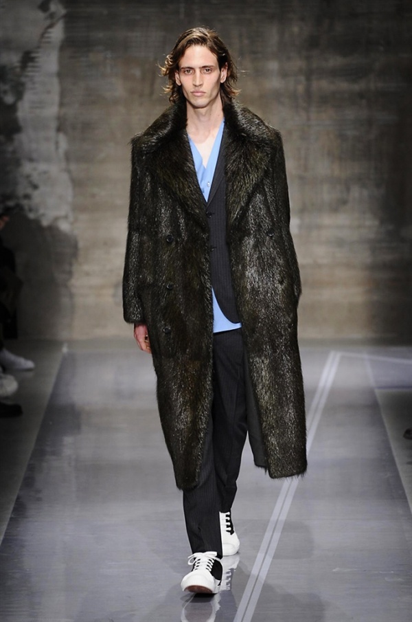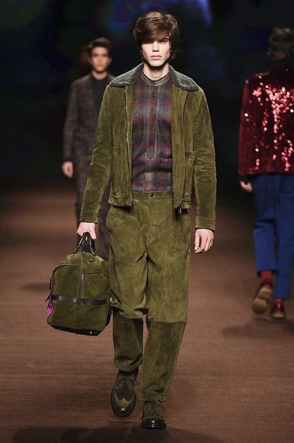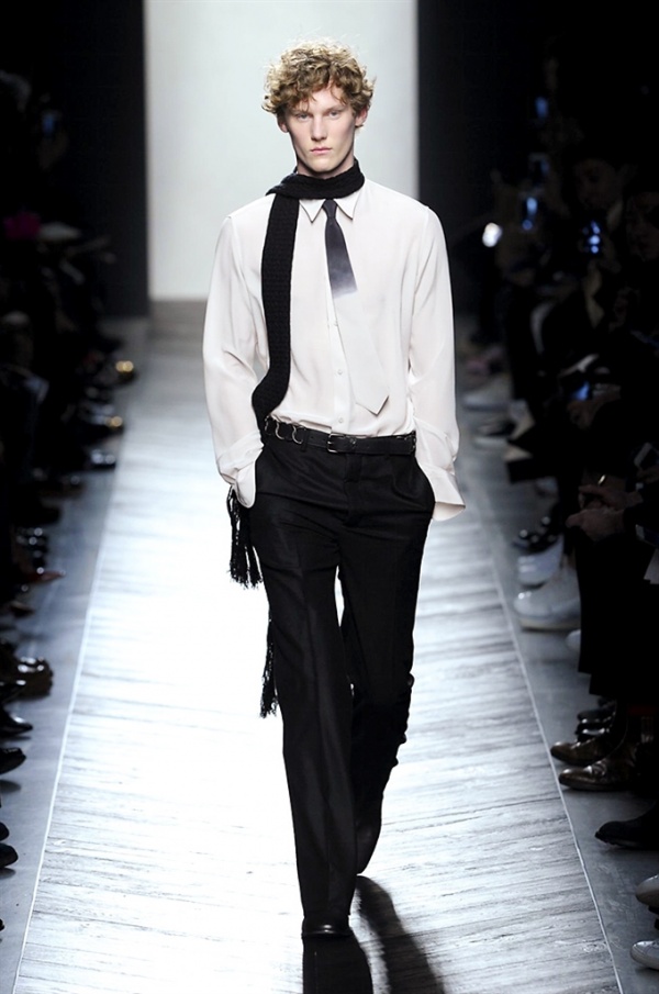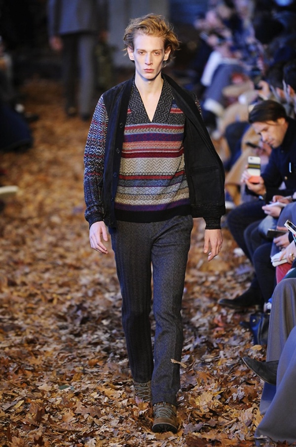 Camminano su foglie gialle autunnali i modelli di Missoni, che accompagnano l’atmosfera calda delle classiche maglie colorate. Anche per Etro l’atmosfera è calda, i colori accesi degli ampi pantaloni in suede (fuxia, giallo,verde), si mescolano a capospalla animalier, tute tartan e ai classici grigi e cammello. Ricami anche per N.21, applicati su gros grain, arricchiscono pantaloni classici senza disturbare. Parka e felpe si mescolano creando un look non scontato. Silhouettes allungate, sobria ed elegante, la collezione disegnata da Tomas Maier per Bottega Veneta, giacche doppio petto e tanto velluto, meno belli i modelli con i pantaloni in pelle sportivi. Tanta pelle per i bikers di Dirk Bikkembergs e per quelli di Philipp Plein, chiodi e scarpe borchiate, ma se proprio dovessi sentirmi a mio agio su una moto, meglio la collezione pratica e comoda di Diesel Black Gold, total black con tocchi di blu, grigio e petrolio.
