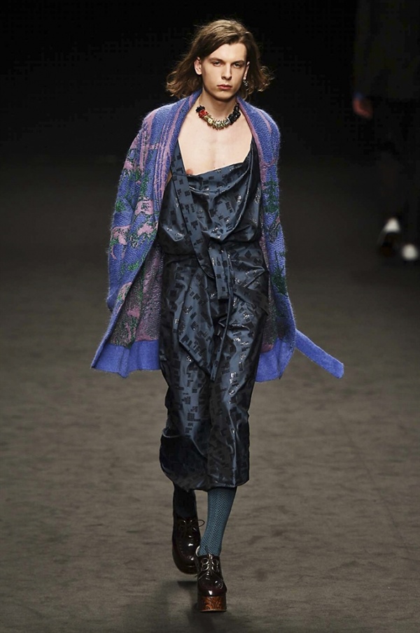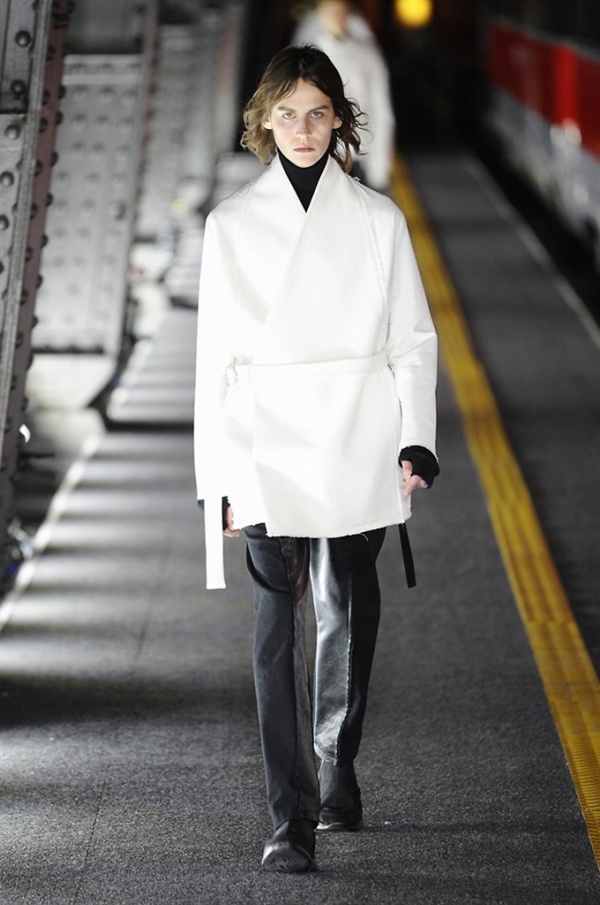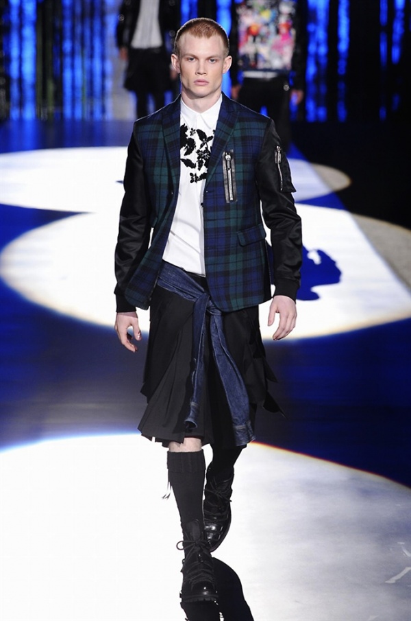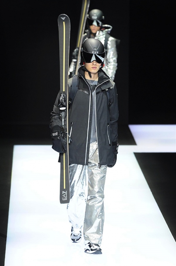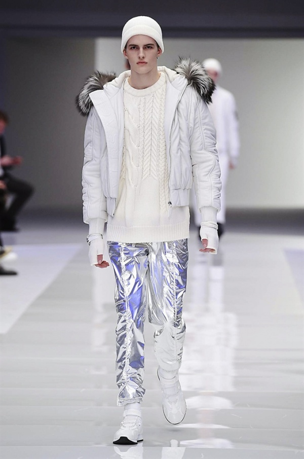 Decisamente sporty la collezione di Versace, colori improbabili, lilla e argento, tessuti tecnici, maglie oversize. Sparkling anche gli sciatori di Emporio Armani, le tute argento rifletteranno sul bianco della neve abbagliandoci, cosi come resto abbagliata dalle più sobrie giacche coreane e dagli smoking in velluto. Mentre per Armani prima linea i pantaloni sono scivolati e le spalle ampie, accompagnano le uscite modelle che hanno strappato la mia attenzione sugli outfits femminili decisamente più interessanti. Il lato femminile della sfilata pop DSquared2, è sicuramente più affascinante, sovrapposizioni su pantaloni skinny, di bermuda, gonne ampie, lunghe, al ginocchio, a panello. Stesso discorso per le tuniche drappeggiate da indossare sui pantaloni da Vivienne Westwood, dove nel mix di stili è sempre il lato “transgender” quello più interessante. Silver ma anche gold la pelle di Calvin Klein Collection, denim bianco spalmato glitter, mixato al fresco lana e al cammello. Un’unica stampa mimetica con tanto di passamontagna per tutte le uscite di Moncler Gamme Bleu, talmente mimetica che non l’ho neanche notata.