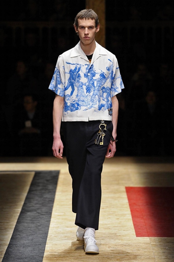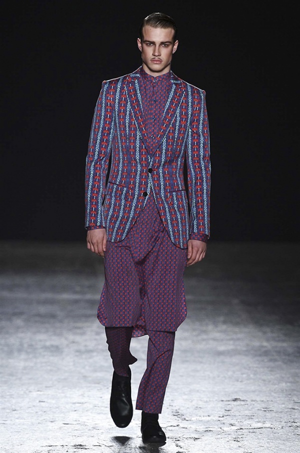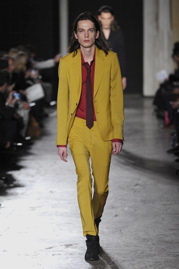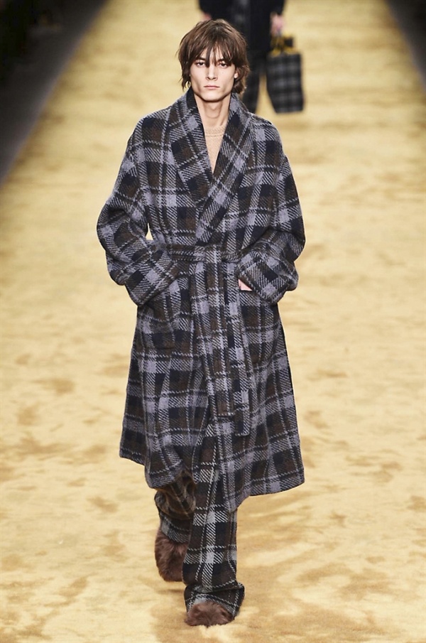 Nella classica collezione Canali scelgo la meno ovvia camicia giallo acido, così come da MSGM punto l’occhio su dei morbidi pantaloni in fustagno grigio con grossi fiori rossi dall’aria molto “cozy”. Troppo cozy Fendi che con le sue “robe de chambre” rimarrei appunto “dans ma chambre”. Damir Doma invece ci fa uscire, e sceglie la stazione centrale di Milano per far sfilare i suoi modelli metropolitani con contaminazioni nipponiche. Modernissimo. Debutta al Teatro Armani di Milano Lucio Vanotti, linee rigorose, rivisitazioni di cappotti/vestaglia militari, righe verticali, pantaloni morbidi e scivolati, tuniche e top monospalla come da Westwood. Tagli sartoriali da Zegna, Stefano Pilati alterna pantaloni slim a quelli ampi con pinces, mantelle, giubbotti e coats eleganti. Mi piace di più Corneliani, una collezione portabilissima, le linee sono asciutte, i pantaloni a sigaretta hanno la vita alta, le maglie hanno la trama larga e le giacche cadono morbide. Milano moda uomo si chiude col designer britannico Hellen Anthony, tuniche indiane indossate su suits dalle stampe coordinate.