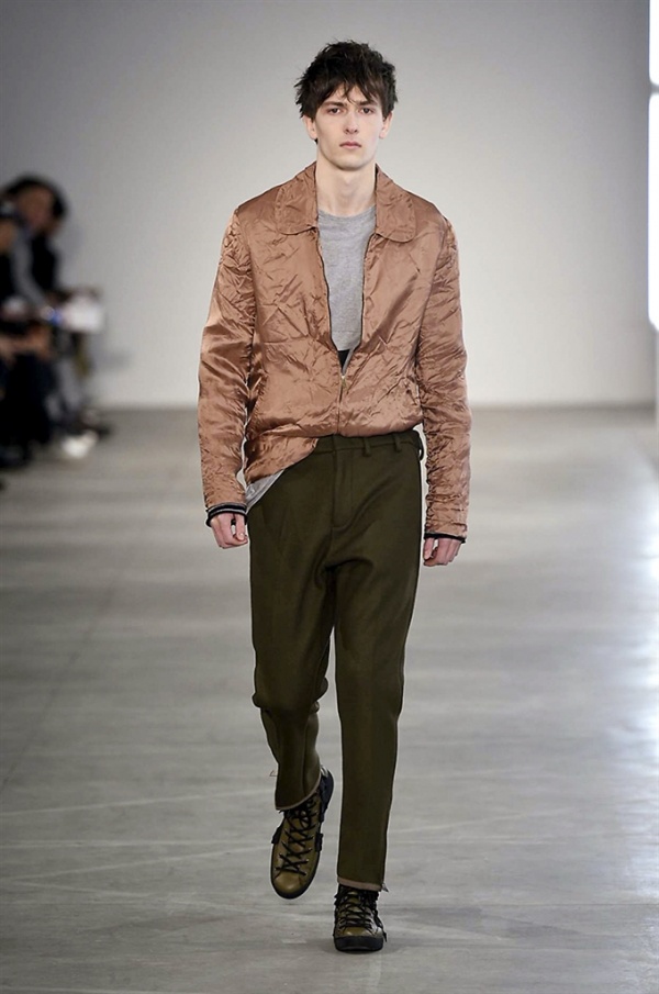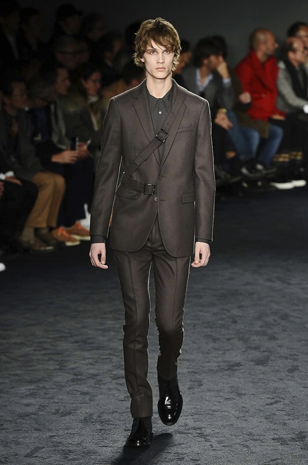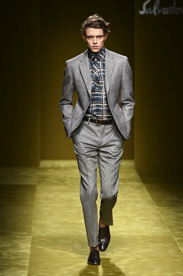 Tra tutto il nero del solito minimalismo di CostumeNational, sono i colori accesi di alcuni abiti che hanno acceso la mia attenzione altrimenti sopita. Mostro più interesse per i fiori, il tartan, le pellicce e le salopette gipsy/chic di Marras, mentre non riesco a farmi ammaliare dalle stampe che l’artista Christophe Chamin ha disegnato per Prada, belle invece le felpe in nappa da usare come capospalla. Da Ferragamo saltano all’occhio i grafismi su maglie e camicie che interrompono la sobrietà degli outfits. Mix minimal/sporty assecondati anche dal connubio di cachemire con tessuti tecnici e fresco lana per Neil Barrett. Giacche e cappe con imbracature diagonali da Jil Sander, tanta pelle ed elegantissime jumpsuit in gabardine di lana, cappotti allacciati con mezza cintura laterale che si vedono anche da Marni, qui meno convincenti le “camicie di forza” con abbottonatura sulla schiena. Bello un asciuttissimo completo bordeaux scuro con camicia celeste a fiorellini.