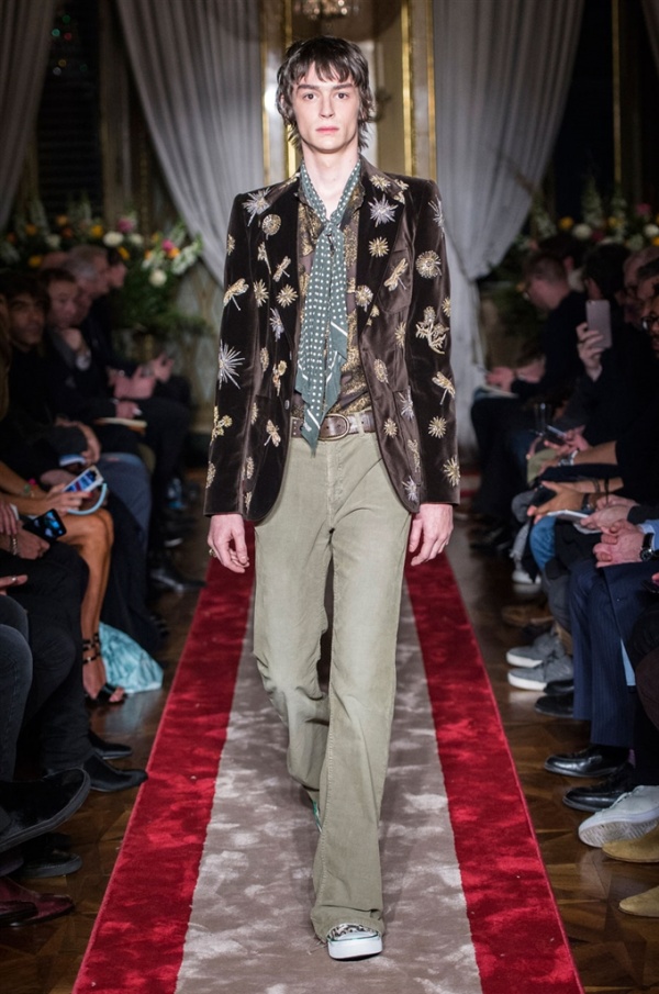 MILANO – Scostumista: Milano Moda Uomo Inverno 2016/17 FOTO. Sono finite martedi le sfilate “Milano Moda Uomo” per il prossimo autunno-inverno. Venerdi 15 gennaio ore 20.00 s’inizia con Roberto Cavalli: Boho/Rock/Glam/Seventies, giacche in velluto ricamate, pelle a righe multicolor, grosse sciarpe tricot, classici capospalla animalier, suits broccati, colori pallidi e polverosi, sneakers sotto ogni preziosissimo outfit; alla fine della sfilata mi chiedo perché Peter Dundas non è riuscito a fare così bene anche per la donna. Così come indosserei tutta la collezione uomo di Cavalli, da Gucci, se Alessandro Michele si mettesse a progettare una collezione per cani proverei ad indossare anche quella! Non ho mai calibrato il mio entusiasmo nei confronti dei suoi “costumi”, perché più che semplici vestiti i suoi sono costumi teatrali, ogni outfit è un racconto a sé, interpreta un personaggio con una sua storia che ben si amalgama al mood d’insieme. Velluti ricamati, bordi di pelliccia, broccati, colori e patterns anni ’70, ironizzati da t-shirt con stampe Snoopy.