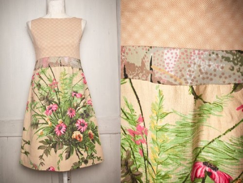 Il concetto di base è un patchwork di tre pezzi per ogni abito: un riassemblaggio di materiali vintage che ripensa anche alle loro caratteristiche. Il corpino e le maniche dei nuovi vestiti sono, infatti, tagli di stampati ricercati appositamente per la loro funzionalità.