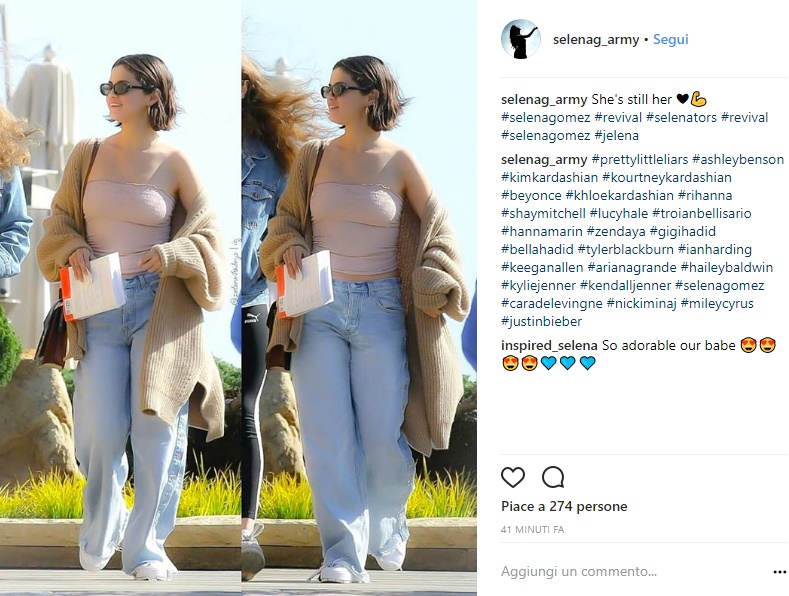 A questo punto il più è fatto! Abbina una semplice sneaker bianca, una postina a tracolla (Selena ha scelto quella di Louis Vuitton), occhiali neri e un paio di bellissimi orecchini a cerchio. Il look easy chic e super glamour di Selena Gomez è pronto! Se questo articolo ti è piaciuto vai a sbirciare anche i 5 look per la primavera chic e fashion assolutamente da copiare! Inoltre, non dimenticarti di seguirci su Facebook per tante foto e consigli di moda!