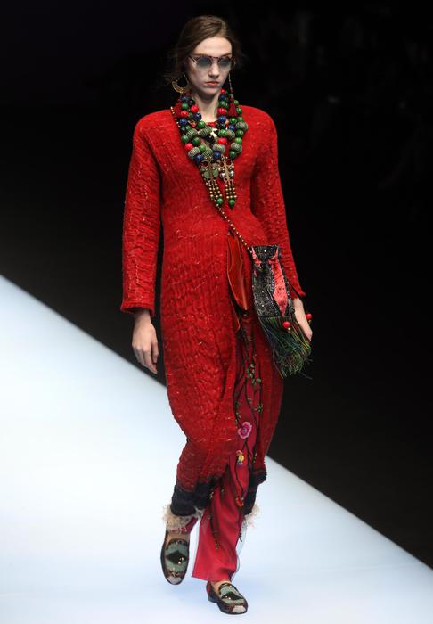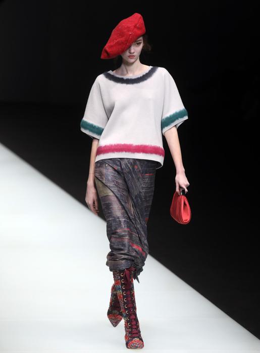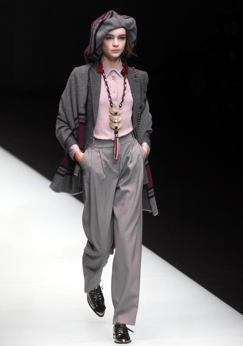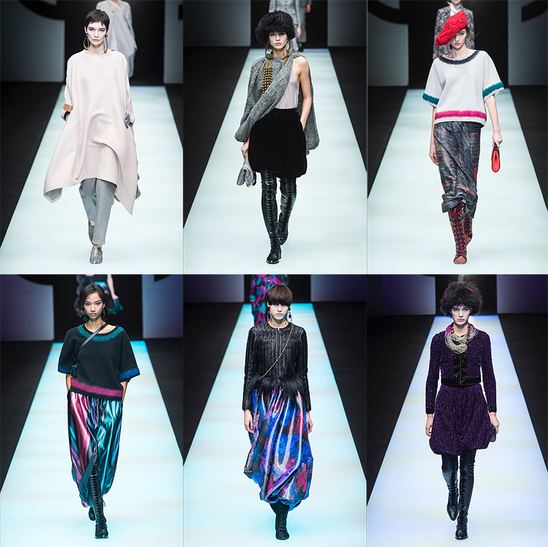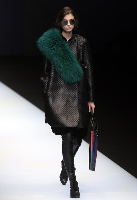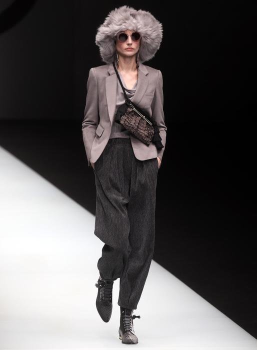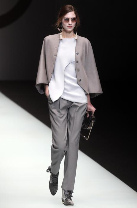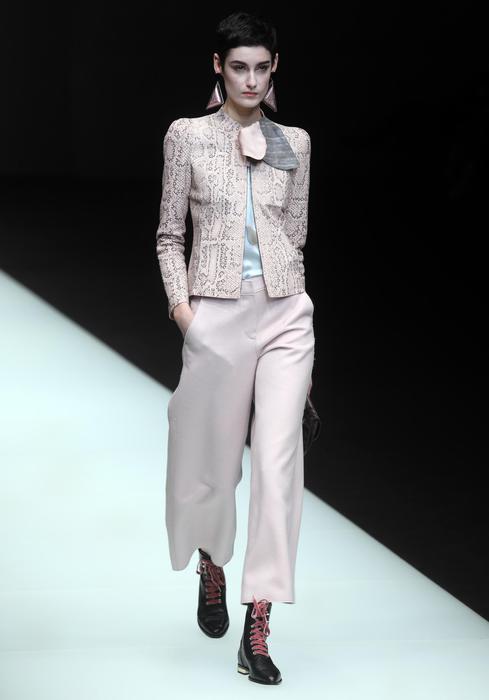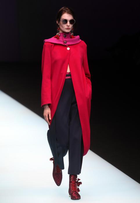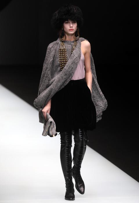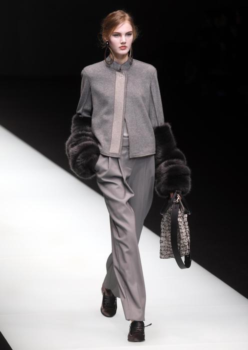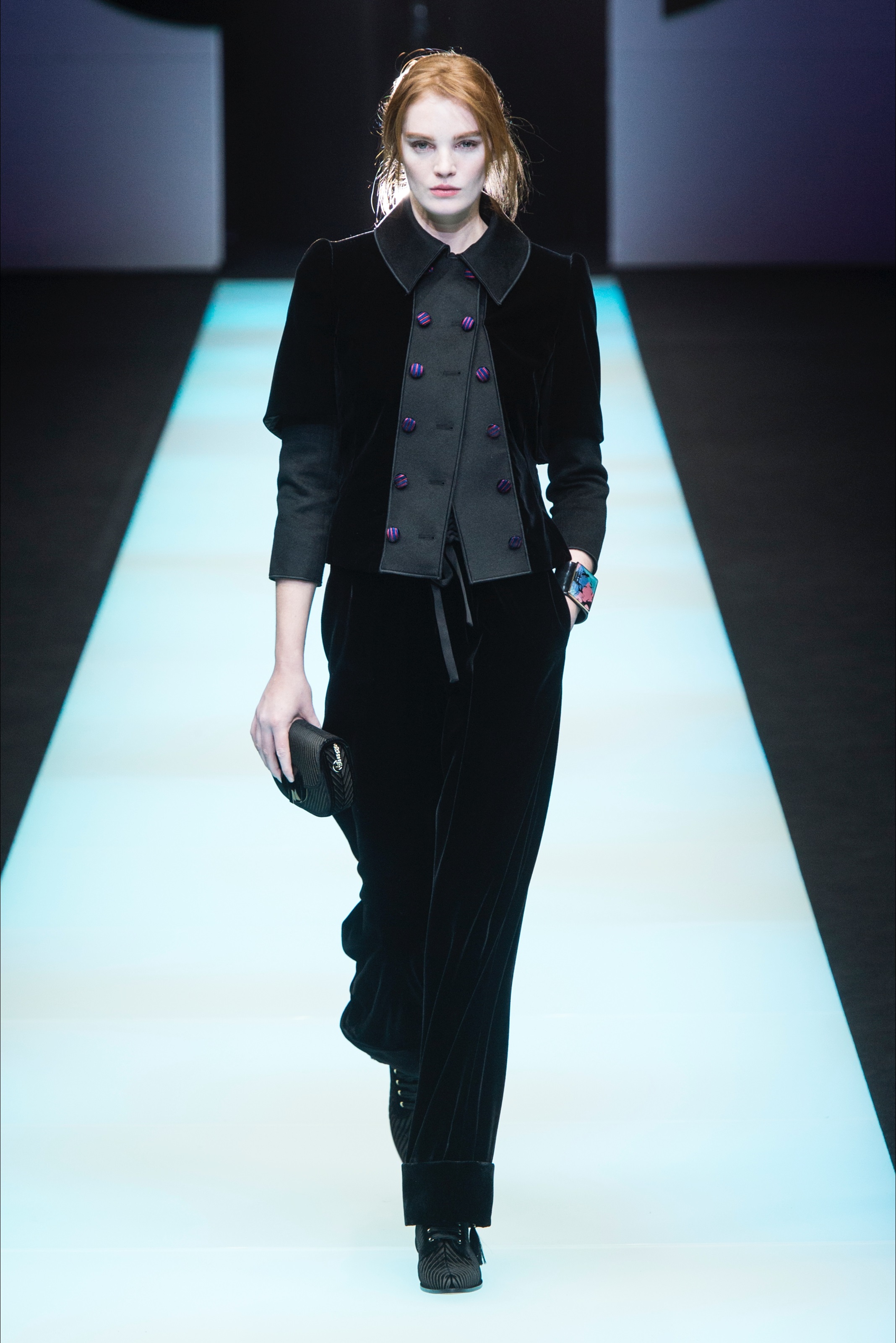 Ed è vero. Giorgio Armani riesce a rendere chic i tempi moderni senza fronzoli, esagerazioni e trovate eccentriche. È una donna femminile, elegante e soave quella di Armani. Pantaloni morbidi, giacche corte e cappotti lunghi, caldi ed essenziali. Baschi in pelliccia ecologica, grandi ma non eccessivi e dall’originale forma “parisienne”. Ancora una volta il tessuto protagonista è il velluto, e i colori oltre al classico nero si declinano in rosso, fuxia, azzurro e le ormai famose “pennellate metalliche”.