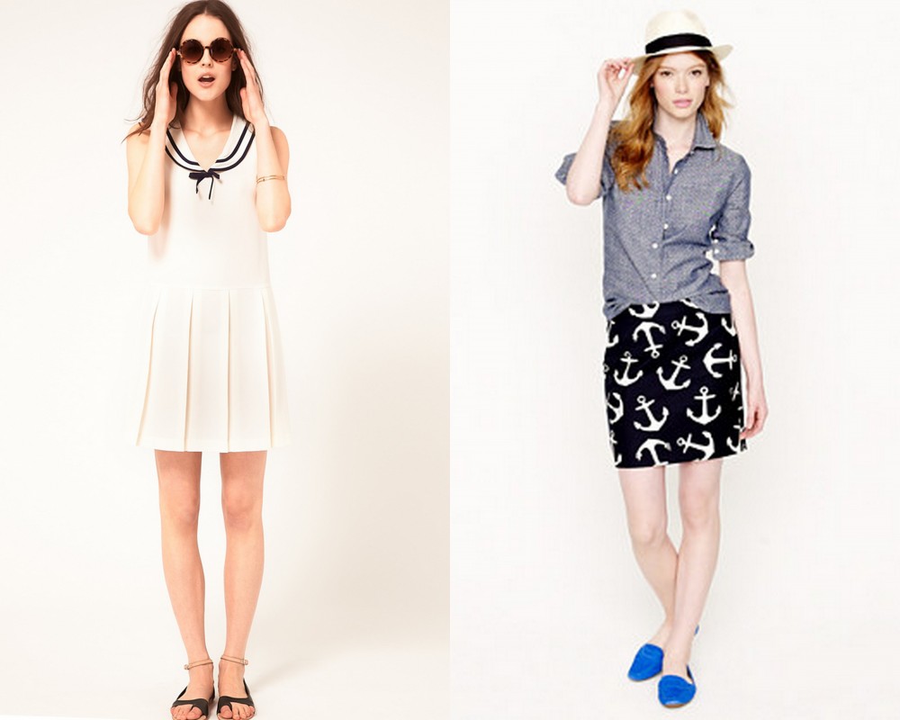 A sinistra: Abito senza maniche navy, shop by Jeager, da € 217 A destra: gonna blu con ancore, J.Crew, € 103,80