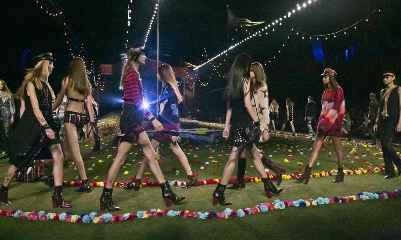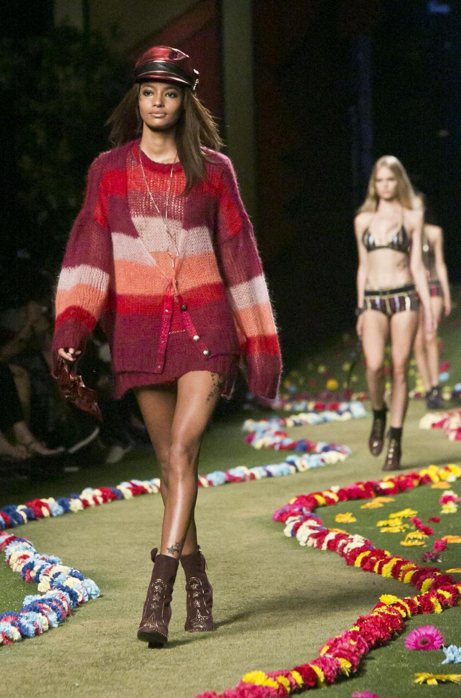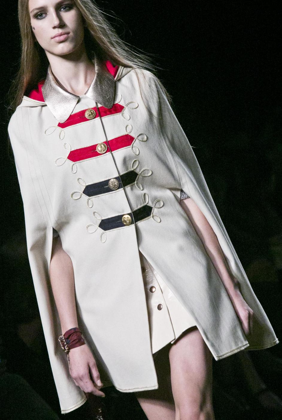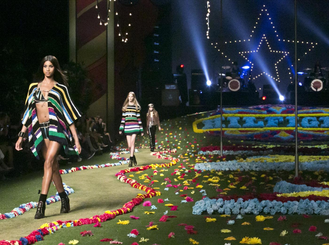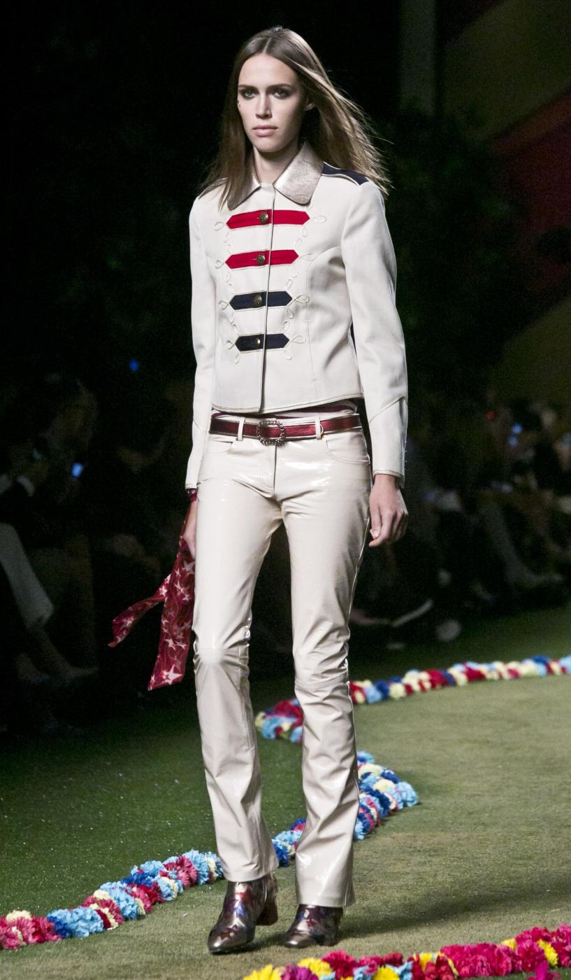 “Come i Rolling Stones, i Beatles, Jimmy Hendrix, David Bowie e Janis Joplin. Hilfiger ha sempre unito moda e musica e ieri, all’Armory, ha creato una scenografia spettacolare, ispirata alla copertina del disco di Sergeant Pepper’s con fiori, un prato vero e un palco illuminato da stelle. Gli abiti sono un moderno e affascinante remake di giacche, pellicce, mini gonne e stivali usati in palcoscenico dai divi del rock. In passerella sfilano Georgia May, figlia di Mick Jagger, Ella, la bis-nipote di Keith Richards. In prima fila, Tali, figlia di Annie Lennox, Amber, rampolla di casa le Bon. Sul palco si esibiscono Tara, il figlio di Brian Ferry e Steve Hash, il fidanzato di Hally Hilfiger”