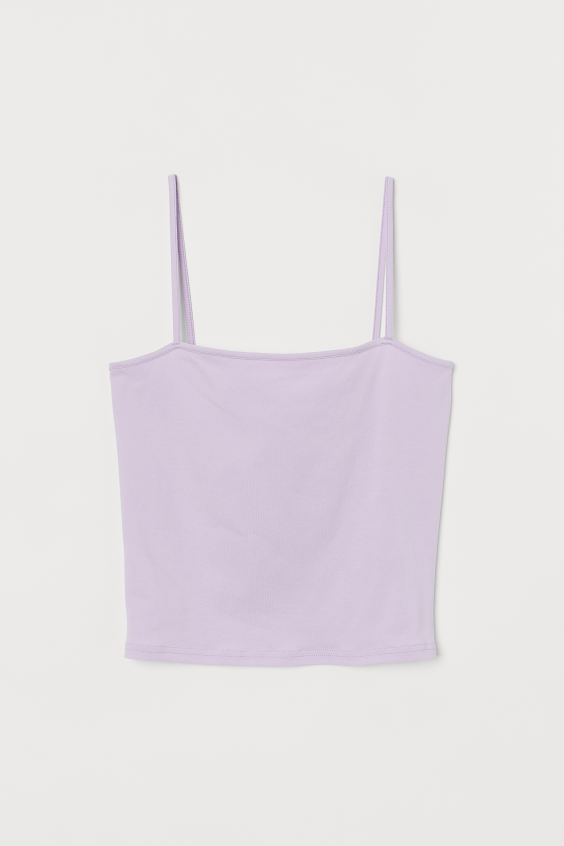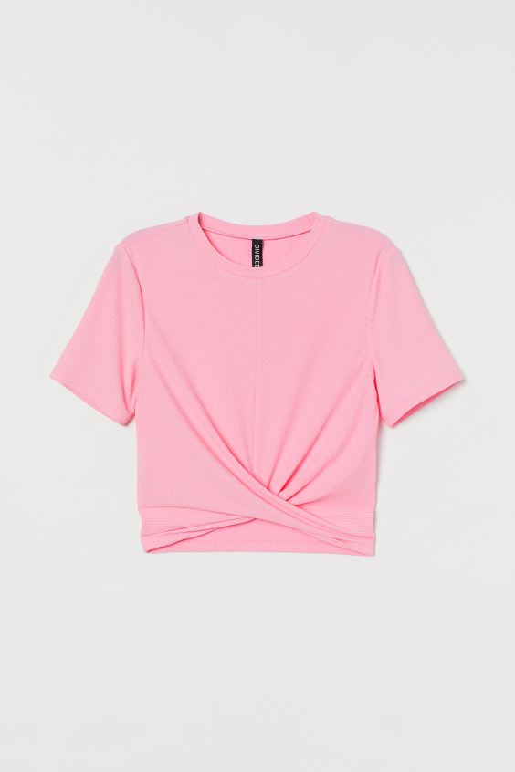 Abbiamo trovato sul sito on line di H&M dei top color pastello ideali per allenarsi con stile. Il primo è rosa, corto in leggero jersey a costine con nodo decorativo davanti. Scollo rotondo, maniche corte. Disponibile in 5 diverse varianti. Prezzo: 9,90 euro. Un modello non adatto per sudare, ma magari per una sessione di yoga collettiva in diretta con le tue amiche.