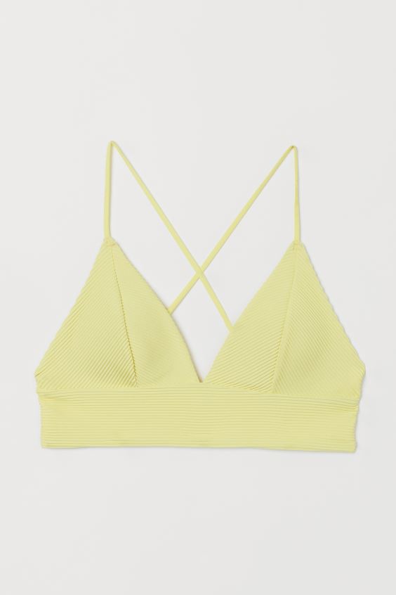 C’è poi un top color pastello, utilizzabile anche come reggiseno sportivo. Un bikini a triangolo senza ferretto con inserti removibili che modellano il seno e offrono un buon sostegno. Alto bordo in basso. Spalline sottili e regolabili da allacciare in varie posizioni. Senza allacciatura. Foderato. Anche in questo caso ci sono molte varianti. Prezzo: 14,99 euro. Terza alternativa, molto low cost, un top lilla a aderente in jersey di cotone. Spalline sottili.
