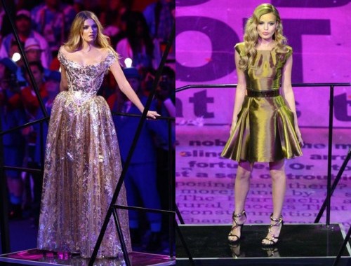 Così, se Lily Cole indossava un abito da cocktail Erdem ricamato e in pizzo e decolletè oro con cinturino alla caviglia griffate Charlotte Olympia, Stella Tennant ha mostrato un abito pantalone in maglia metallica e cristalli Swarovsky Christopher Kane. indossava un abito da sera in oro e in pizzo griffato Burberry dal cui spacco trapelavano delle sexissime decolletè Jimmy Choo. Un bellissimo Vivienne Westwood ricamato in oro vagamente ispirato al Royalty del 17° secolo inglese veniva sfoggiato invece da Lily Donaldosn, mentre la più giovane del gruppo, Georgia May Jagger, indossava un abito da cocktail firmato Vicotria Beckham in metallo gold e scarpe Giuseppe Zanotti. Poi Jourdan Dunn, una “spanna sopra le altre”, soprattutto per merito del suggestivo copricapo in piume ed oro Stephen Jones abbinato ad un abito in pelle Jonathan Saunders oro e nero.