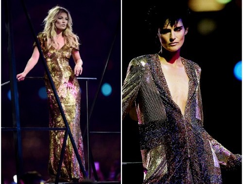 Poi, loro: le vere “regine” tra le top model: la venere nere Naomi Campbell con il suo tipico passo felino sulla passerella e la sempre bellissima Kate Moss, entrambe con un abito Alexander McQueen. Un abito in oro con strascico scintillante per Naomi, un abito lungo ed elegante con profonda scollatura per Kate.