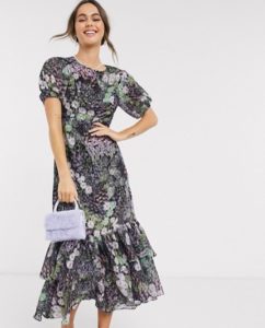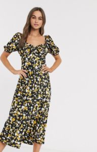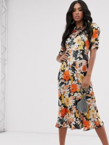 Il primo è un vestito lungo da giorno a fiori animalier con bottoni firmato Asos Desing. Prezzo: 57,99 euro. Il secondo tubino è un abito da giorno lungo con volant e motivo patchwork a fiorellini.Prezzo: 96, 99 euro. Terzo, un capo midi con taglio in sbieco e maniche a sbuffo in raso a fiori. Prezzo: 60, 99 euro.