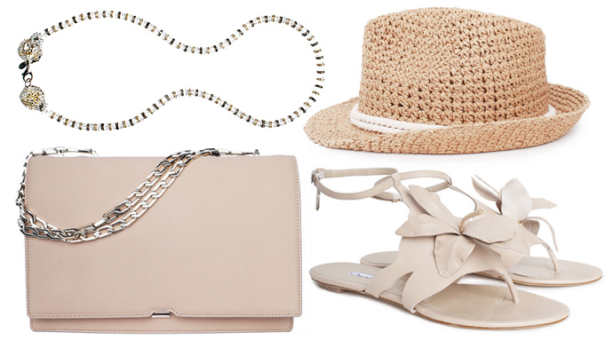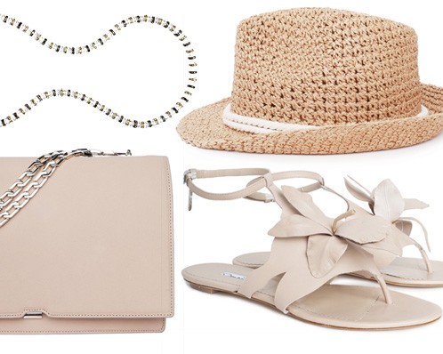 Beige - Collana Erickson Beamon, frizione Victoria Beckham, sandali Oscar de la Renta, Eugenia Kim cappello