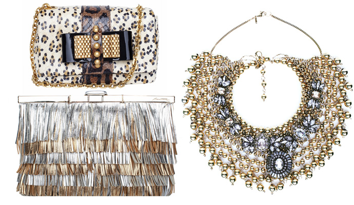 Metal - Clutch Christian Louboutin, clutch con frangeBrian Atwood, collana Erickson Beamon