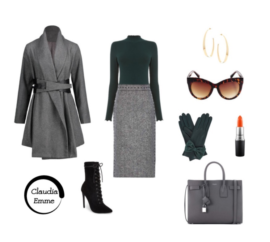 Ieri abbiamo visto un outfit casual-chic formato da un maglioncino rosso a collo alto e pantaloni a palazzo a vita alta. Oggi abbiamo scelto per voi un completo elegante e fashion sui toni del grigio e del verde. Questi due colori stanno benissimo insieme e sono perfetti per creare un look chic e professionale. Inizia scegliendo una maglia verde a costine e a collo alto. Se pensi di sentire freddo puoi mettere sotto un body in cashmere che ti terrà al caldo. La maglia che vi proponiamo si trova online su Warehouse.com e costa solo 26 sterline. Aggiungi una bella gonna grigia a matita, da chiudere sopra la maglia. È perfetta quella in lana di Valentino. Riparati dal freddo scegliendo un caldo cappotto grigio. Quello con cintura in vita e profili in pelle è ora in saldo su Rose gal a 33 dollari. Aggiungi un tronchetto nero con tacco alto e chiusura con i lacci, come quello di Steve Madden, e una borsa grigia ton sur ton con il cappotto come la Saint Laurent. Completa il look con guanti verdi con fiocchetto, occhiali tarte da super diva (li abbiamo trovati su Amazon a soli 8 euro) e orecchini in oro a cerchio. Infine, un tocco di rossetto arancio per un effetto super chic.