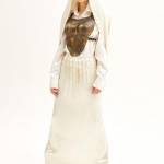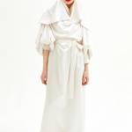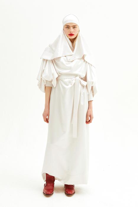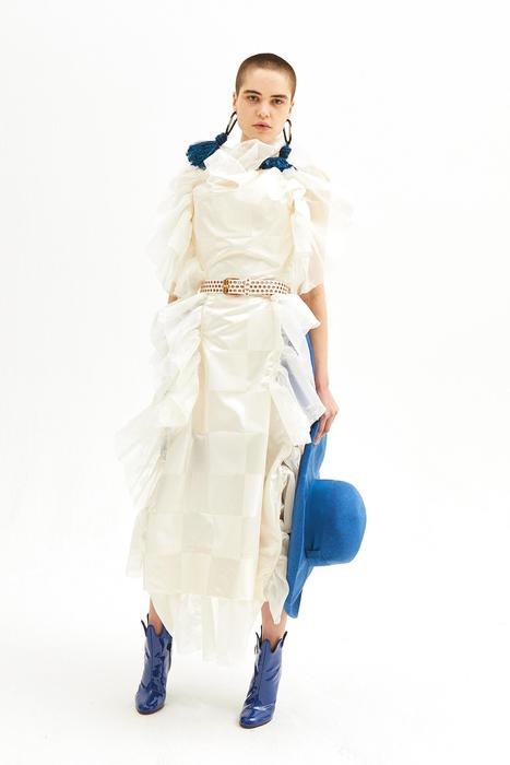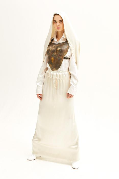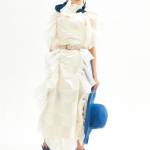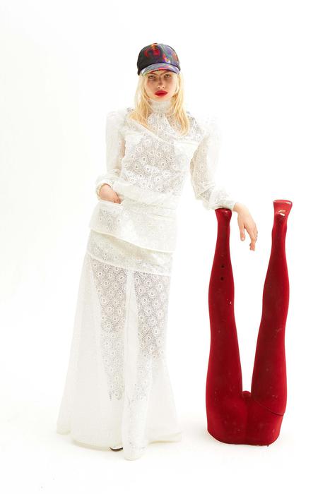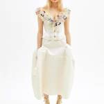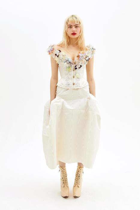 Nella capsule, decisamente trasgressiva, lo stilista ha onorato le proprie origini austriache e la tradizione Westwood creando capi genderless – giacche, gonne, abiti e corsetti – realizzati secondo la tradizione austriaca del fatto a mano, impreziositi da ricami floreali. Bretelle da uomo in seta trasformano le maxi gonne, le vesti in twill di seta, tulle o jacquard di seta. I veli diventano parte integrante degli abiti e si indossano in svariati modi. Gli abiti lineari in satin sono la risposta alle gonne a meringa in taffetà. Corsetti in organza con rose ricamate sono abbinate a gonne dall’allure romantico. Il top-corsetto in cuoio marrone interrompe il candore dell’abito in seta. “La sostenibilità – dice Kronthaler – significa indossare gli abiti più di una volta, mixare i vari pezzi e giocare con tessuti e toni di bianco”.