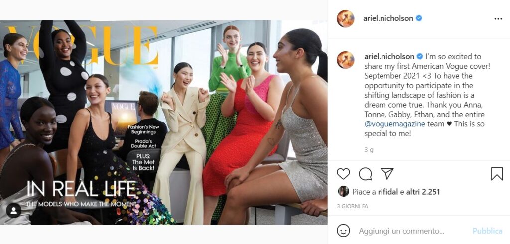 In un post su Instagram, la modella Ariel Nicholson scrive: “Sono così entusiasta di condividere con voi la mia prima copertina su Vogue America! Settembre 2021. Avere l’opportunità di partecipare a questo cambio nel panorama della moda è un sogno che diventa realtà. Grazie Anna, Tonne, Gabby, Ethan e l’intero team di @voguemagazine. Tutto questo è così speciale per me!”