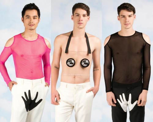 I capi mantengono il tratto “provocatorio”, come i pantaloni con la sagoma di una mano sul cavallo, o le giacche tinta unita con un’unica manica di un colore differente.