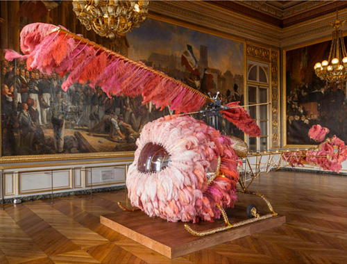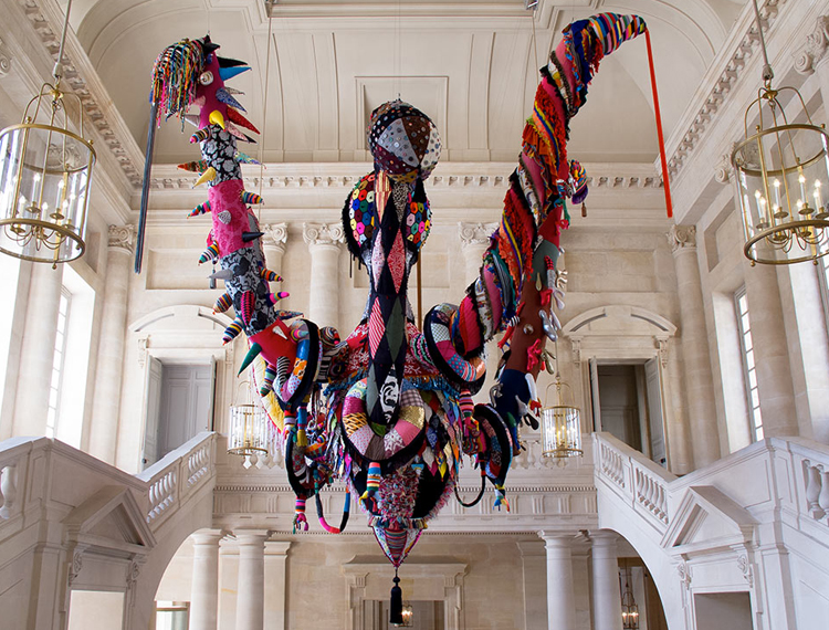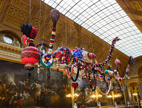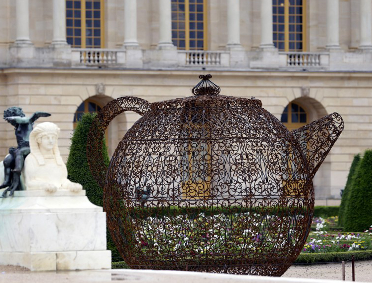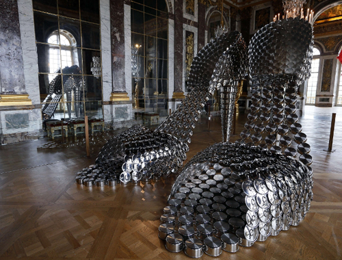 PARIGI – Un paio di scarpe col tacco assassino, ma fatte di tantissime pentole in acciaio (Marilyn), un cuore di elegante filigrana composto però di forchette di plastica (Coração Independente), degli “Alien” di tappezzeria sospesi come lampadari (Royal Valkyrie), gigantesche teiere da giardino (Pavillon de Thé). Queste sono solo alcune delle incredibili, spettacolari opere di Joana Vasconcelos, artista portoghese, che oggi inaugura la sua personale negli incredibili spazi della Reggia di Versailles. In mezzo agli affreschi d’epoca e ai cimeli dei re di Francia si materializzano creature incredibili o disegni alieni. Questa mostra, aperta fino al 30 settembre 2012, si annuncia già come un evento imperdibile ed è destinata a rimanere nell’immaginario collettivo, per la sua forza ironica e i legami col mondo femminile e della moda, come le precenti esposizioni ospitate a Versailles: Jeff Koons, Xavier Veilhan, Takashi Murakami e Bernar Venet.