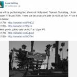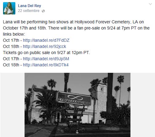 LOS ANGELES – Lana Del Rey canterà in un cimitero. Secondo quanto riportato sulla sua pagina Facebook ufficiale, la cantante ha in programma due show (17 e 18 ottobre prossimi) all’interno dell’Hollywood Forever Cemetery di Los Angeles, in cui riposano personaggi famosi defunti, tra i quali uomini e donne dello spettacolo.