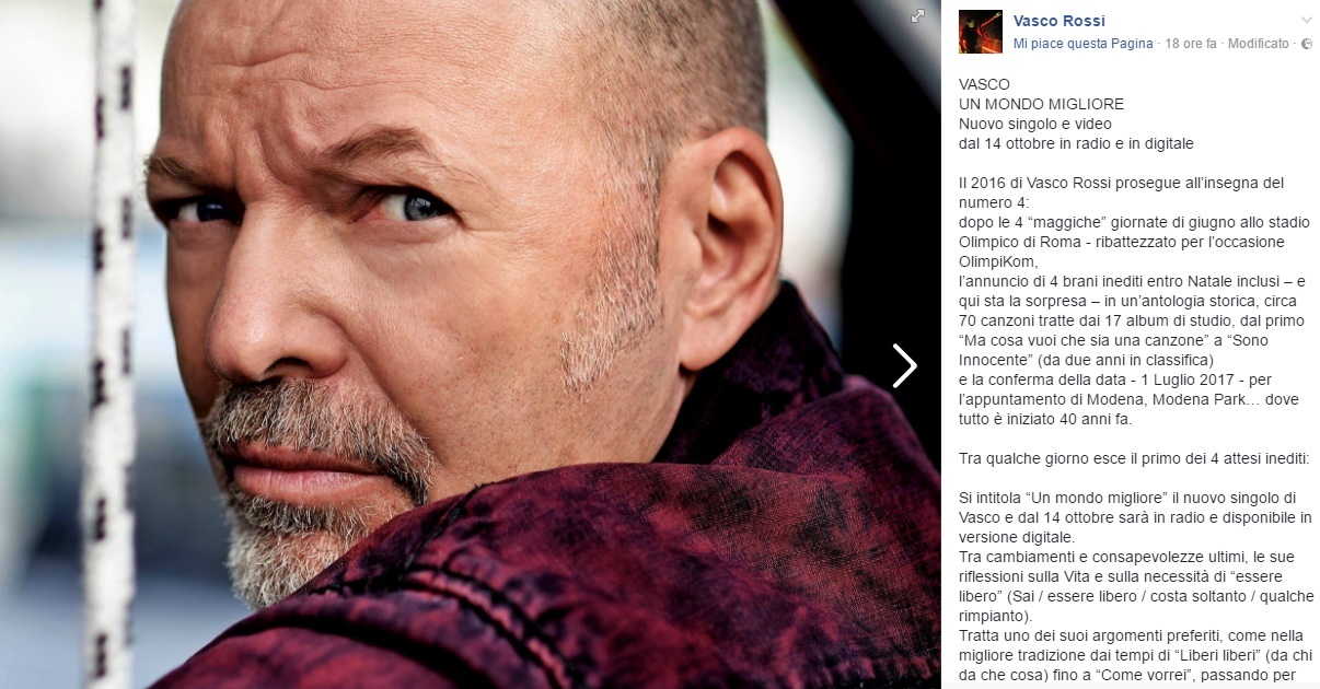 Giorni frenetici per i fan di Vasco: oltre ad aver annunciato la data di uscita del suo nuovo singolo, il cantante ha fatto sapere che a Natale uscirà con un’antologia storica composta da circa 70 canzoni tratte dai 17 album di studio, a partire dalle sperimentazioni cantautorali dal primo “Ma cosa vuoi che sia una canzone” fino all’ultimo “Sono Innocente”, uscito un paio di anni fa e tutt’ora in classifica. Qualche settimana fa il cantante aveva annunciato l’uscita di 4 inediti entro Natale e nei giorni scorsi anche il regista, i protagonisti e le location del singolo “Un mondo migliore” e oggi l’annuncio che l’attesa per i fan terminerà il 14 ottobre, quando il ritorno del Kom sarà definitivo. Un mondo migliore parlerà, come già successo altre volte, di libertà. Il video che accompagnerà il brano è stato ideato e diretto da Pepsy Romanoff, il quale ha diretto un vero e proprio corto che vede come protagonista, oltre lo stesso Vasco Rossi, anche l’attore Vinicio Marchioni, il Freddo di Romanzo Criminale: