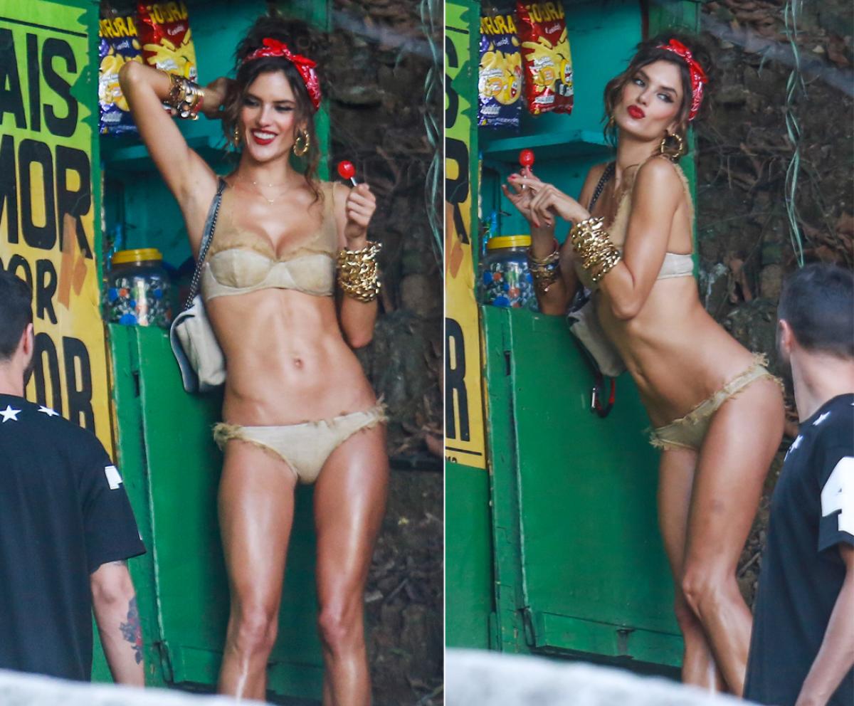 Alessandra, in una prima foto indossa un costume beige che risalta la sua carnagione: in una seconda foto invece, l’angelo di Victoria’s Secret indossa una minigonna a strisce e dei super tacchi ai piedi. Il pezzo di sopra rosa mette in risalto le forme.