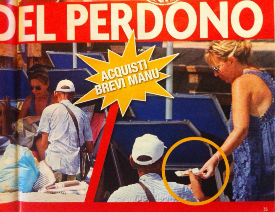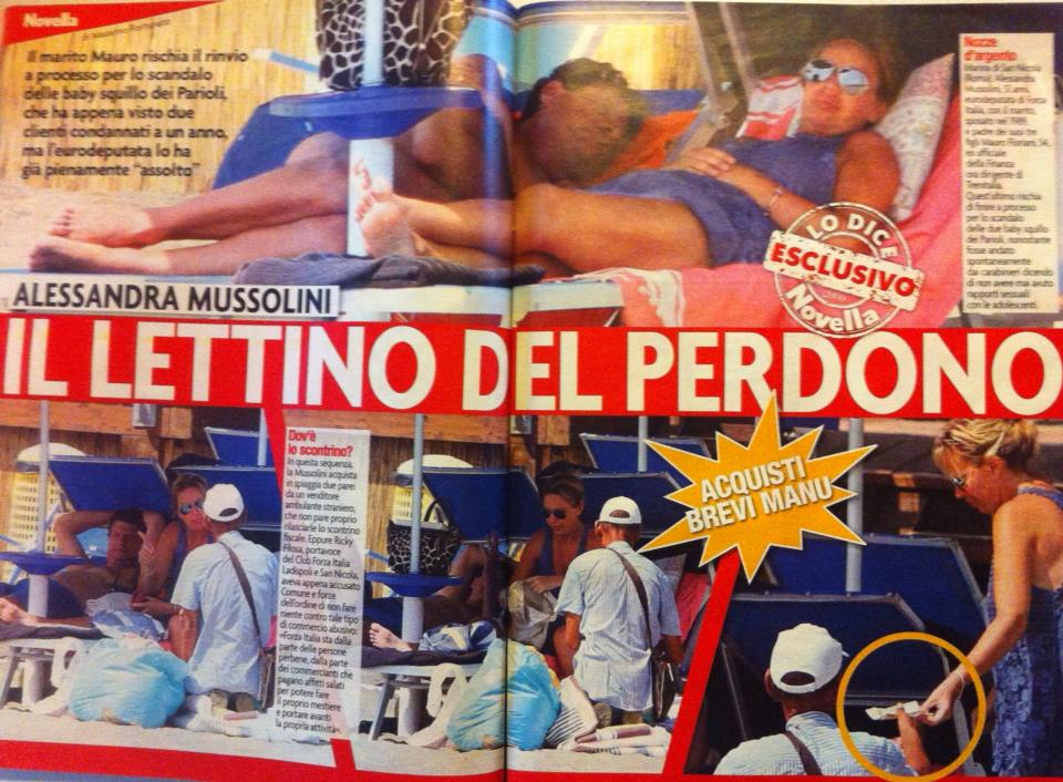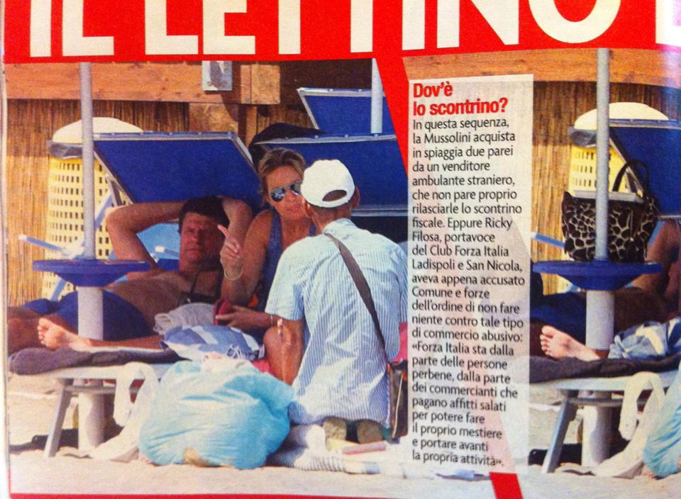 “Alessandra Mussolini acquista in spiaggia due parei da un venditore ambulante straniero, che non pare proprio rilasciarle lo scontrino fiscale”.