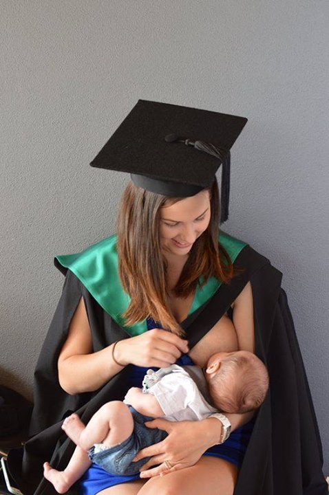 Un neonato di sei settimane, una mamma che lo allatta vestita con l’abbigliamento da laureata. Lei si chiama Jacci Sharkey e il giorno in cui la foto è stata scattata terminava i suoi studi in Risorse Umane e Marketing alla Sunshine Coast University (Australia).