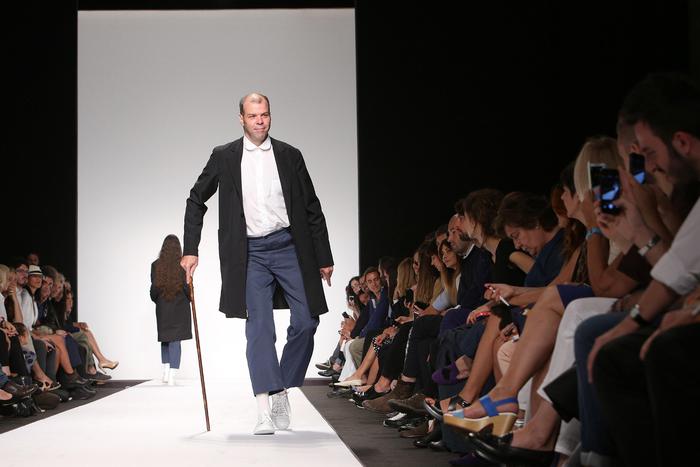C’è anche un suo amico, Daniel, diversamente abile, che sfila determinato con il bastone in un elegante completo in seta e camicia bianca. La collezione gioca sulla dicotomia estetica propria di alcuni personaggi dell’arte, musica e letteratura, protagonisti degli ultimi 50 anni.