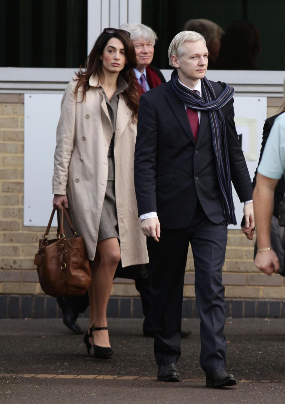 FILE - In this Thursday, Nov 24, 2011 file photo, lawyer Amal Alamuddin, left, is seen walking alongside WikiLeaks founder Julian Assange as they leave Belmarsh Magistrates Court in south east London after his extradition hearing to Sweden to be prosecuted over claims of sexual assault. Hollywood's most eligible bachelor may be getting hitched. A London law firm on Monday April 28, 2014, has congratulated one of its lawyers Amal Alamuddin on her engagement to George Clooney. (AP Photo/Yui Mok, PA Wire, file) UNITED KINGDOM OUT - NO SALES - NO ARCHIVES