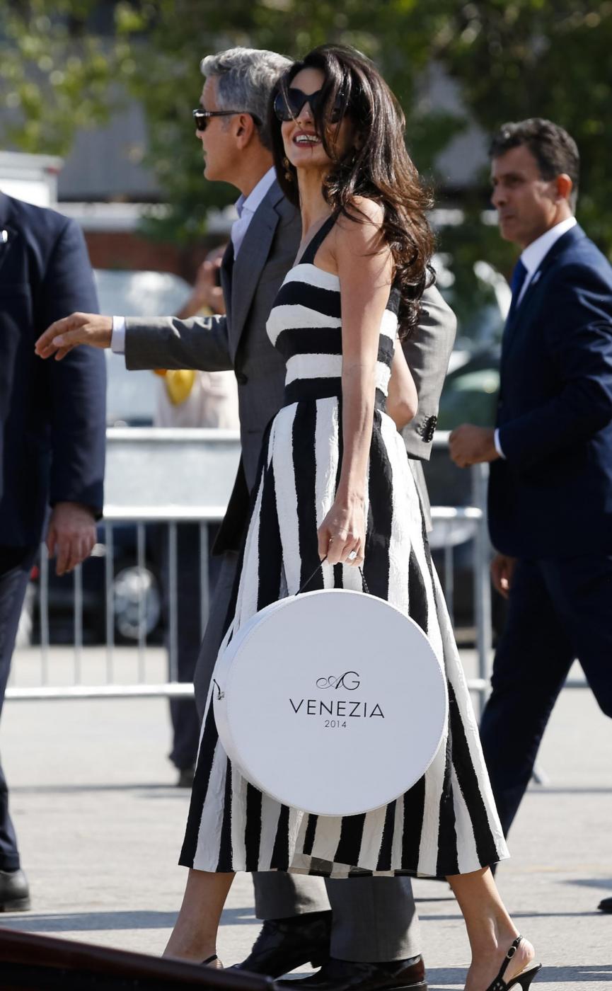 Tra i suoi stilisti prediletti ci sono Alexander McQueen (non a caso questa è probabilmente la casa di moda che ha confezionato l’abito delle nozze), Dolce e Gabbana e Stella McCartney. Estremamente esile, Amal sembra prediligere vestiti con gonna longuette, mai troppo scollati. Tinta unica, generalmente neri, oppure con fantasie fiorate. Per l’arrivo in motoscafo a Venezia, ha scelto un tubino con spalline a strisce nere e bianche, firmato D&G. Per quello della cerimonia nuziale bisognerà invece attendere le prime foto ufficiali.