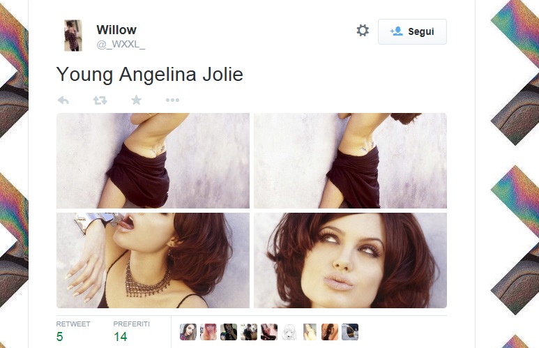 ROMA – Una Angelina Jolie davvero inedita quella che è apparsa su alcune foto diffuse su Twitter. Era il lontano 1995 e Angelina Jolie aveva 19 anni quando ottenne il suo primo ruolo da protagonista, che le aprì la strada come attrice di Hollywood, nel film “Hackers”. Secondo alcuni rumors, la scelta ricadde su Angelina grazie proprio ad alcuni scatti provocanti che convinsero i produttori a sceglierla come attrice principale del film. Quel book fotografico inedito, scattato dal fotografo di Los Angeles Marcel Indik, ha un significato particolare per la Jolie: il film in cui venne presa come attrice protagonista infatti non solo la rese famosa ma la presentò anche al suo primo marito, l’attore inglese Jonny Lee Miller, coprotagonista maschile.