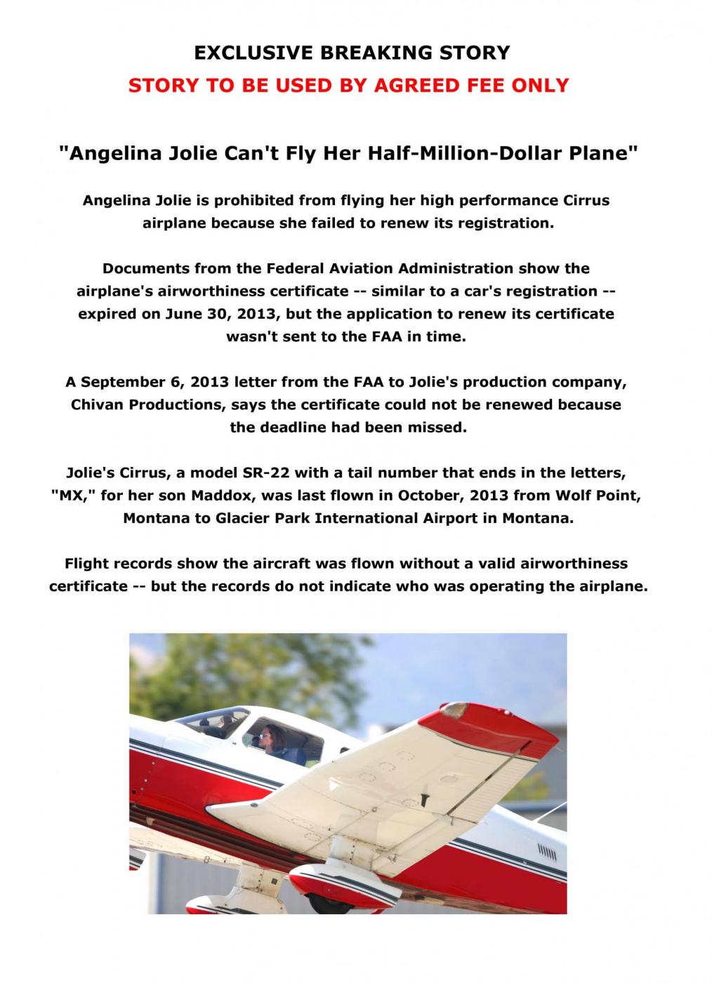 La compagna di Brad Pitt invece, ha dichiarato di aver trasmesso i documenti che a quanto racconta non sarebbero arrivati in tempo. La Jolie è proprietaria di un Cirrus SR-22 del valore di 260mila euro. Dal mese di settembre, la Jolie non può volare ma a quanto pare l’attrice ha trasgredito il divieto volando sopra il Montana. Il reporter del sito americano SixPage.com, ha dichiarato che lo dimostrerebbero i tracciati di volo.