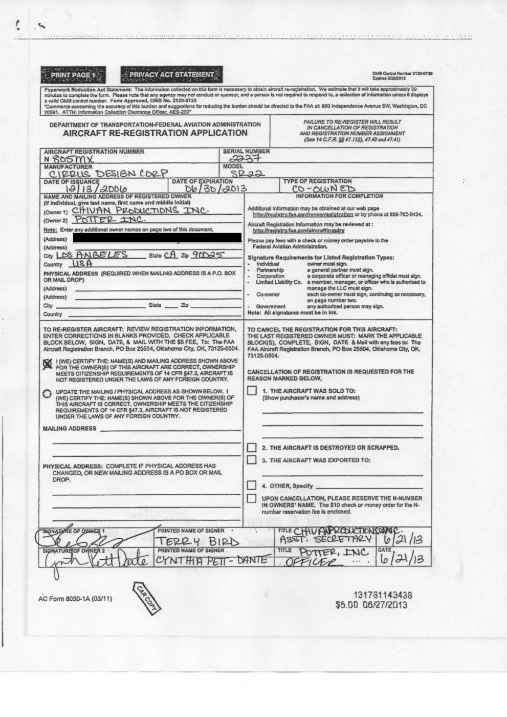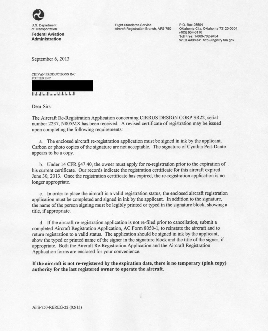 Secondo la società che si occupa, negli Stati Uniti, dell’aviazione civile, la star di Hollywood non ha inviato i documenti relativi all’idoneità di volo prima del 30 giugno, il giorno fissato per la scadenza.