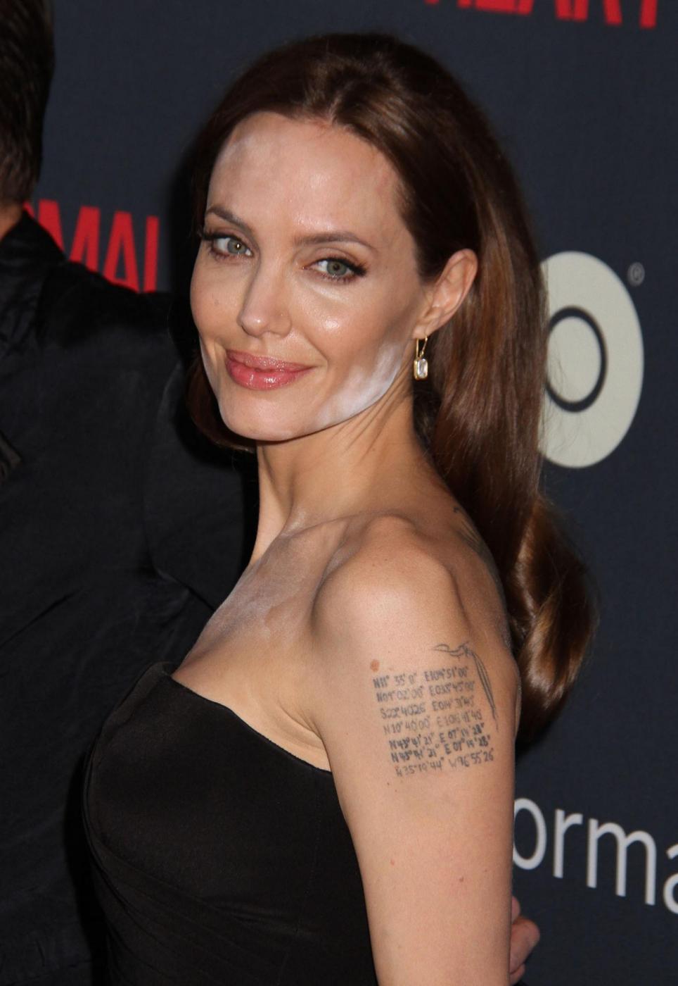 Anche la sempre impeccabile Angelina Jolie ha avuto qualche guaio: eccola a New York alla prima di “The Normal Heart”, di cui Brad Pitt è produttore, con una vistosa macchia bianca sul viso. Possibile che non se ne sia accorto nessuno? Possibile: si tratta infatti di un tipo di cipria che a occhio nudo non dà alcun problema, salvo rivelare improbabili macchie solo in foto grazie alla reazione suscitata dai flash. Angelina non è la prima star a cadere nel tranello di questa cipria, anche Nicole Kidman anni fa ne fu vittima. Perlomeno è in buona compagnia. (Foto Lapresse).