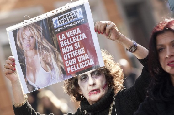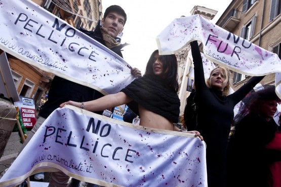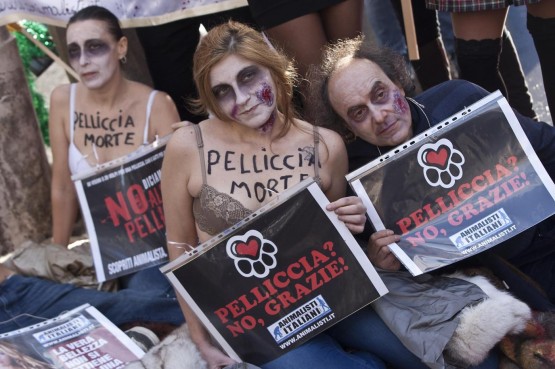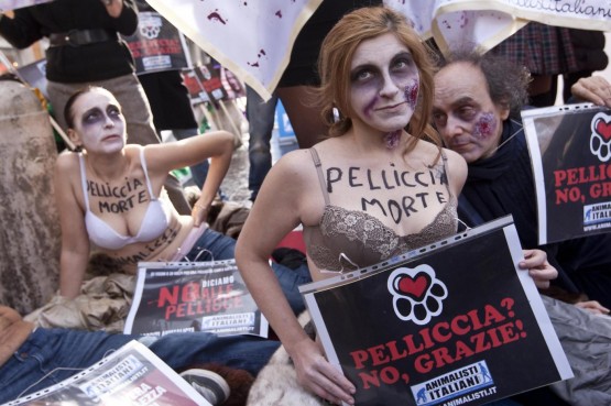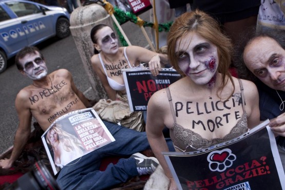 Contro di loro, altre modelle si sono travestite da zombie con indosso pellicce sanguinanti. Walter Caporale, Presidente degli Animalisti Italiani Onlus ha spiegato il senso della manifestazione: “Nonostante il difficile contesto economico la domanda di pelliccia non è mai stata così alta nel mondo. Le cifre lo dimostrano: la produzione mondiale di visoni e volpi ha avuto nel 2011 un incremento del 6 per cento rispetto al 2010 con un totale di 57 milioni di pelli. L’Europa ha una posizione di leadership: con 28 milioni di pelli detiene la metà della produzione di visoni e di volpi. Anche l’Italia nel 2011 ha incrementato di 35.000 capi la produzione di visoni pari al 20% in più rispetto al 2010”.