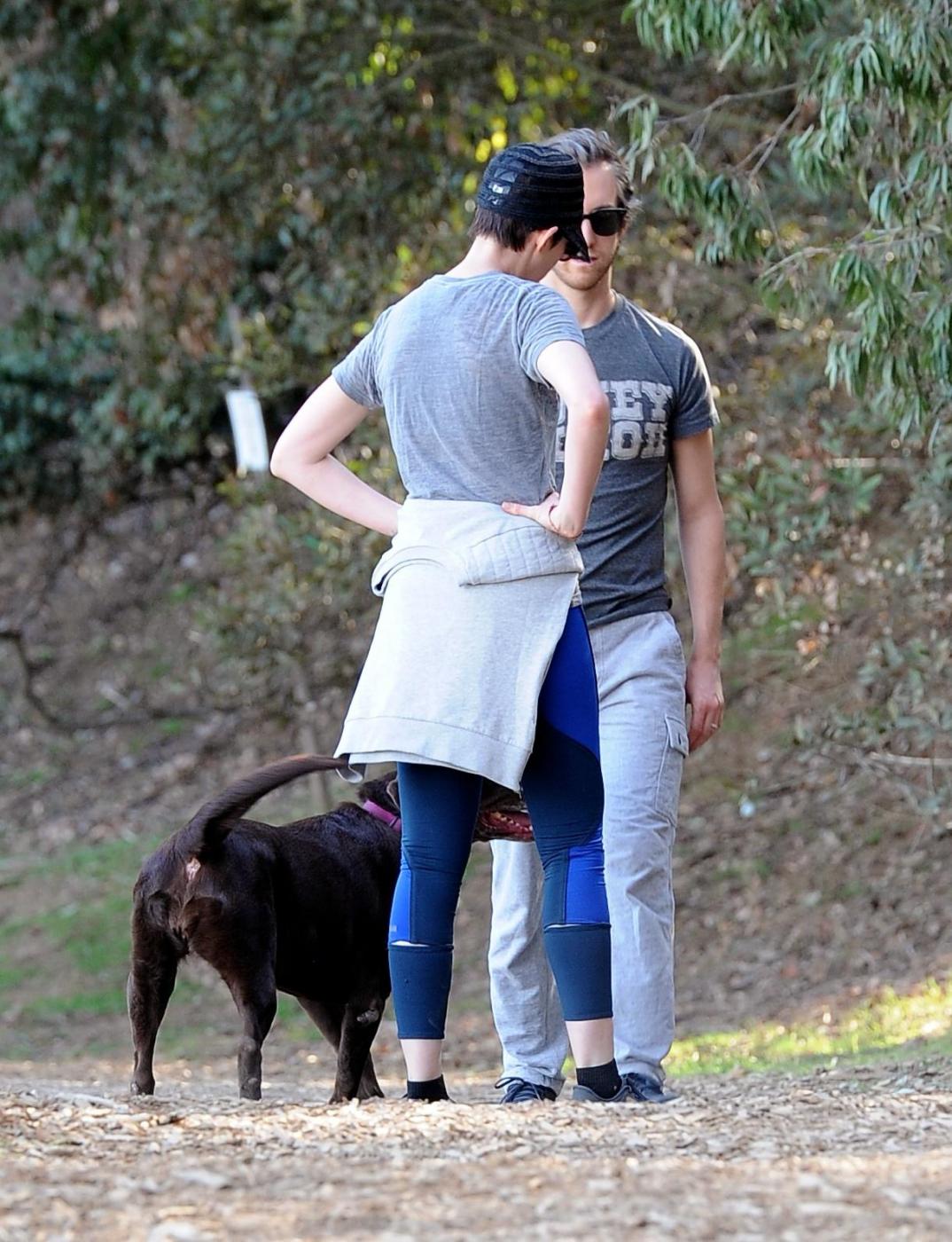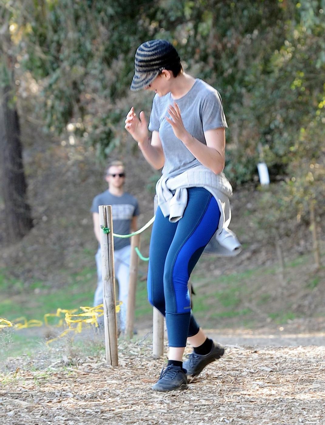 E così Anne Hathaway, probabilmente per perdere i chili presi in questi giorni di festa, si fa fotografare con indosso t-shirt comoda, leggings e maglione legato in vita, mentre con questa mise semplicissima fa jogging in un parco di Los Angeles in compagnia del marito Adam Shulman e del loro cane (foto LaPresse)