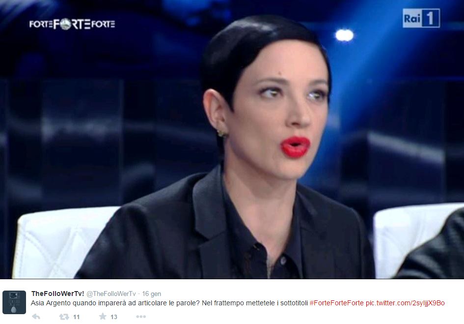 ROMA – Asia Argento cambia look, castigatissima a Forte Forte Forte, il nuovo talent di Raffaella Carrà, in onda su Rai1 il venersì sera. La figlia del grande regista Dario Argento, che partecipa al reality in qualità di giudice, così come la Carrà, non ha particolarmente colpito il pubblico per il suo look, ostentatamente semplice. Anzi, nel servizio fotografico di presentazione del programma, l’attrice ha indossato un abito in pelle grigia che ricordava vagamente quello di una suora. Invece per la prima puntata, la scelta è ricaduta su un look total black con tanto di giacca in pelle nera. Su Twitter c’è chi ha ironizzato: “L’idea di mettere Brian Molko dei Placebo in giuria è fortissima”, in riferimento all’outfit cupo di Asia. Sono lontani i tempi in cui l’attrice dava scandalo baciando in bocca un Rottweiler in una scena del film Go Go Tales, diretto da Abel Ferrara. Vero è che il programma è solo all’inizio e dunque la Argento potrebbe ancora stupire i telespettatori.