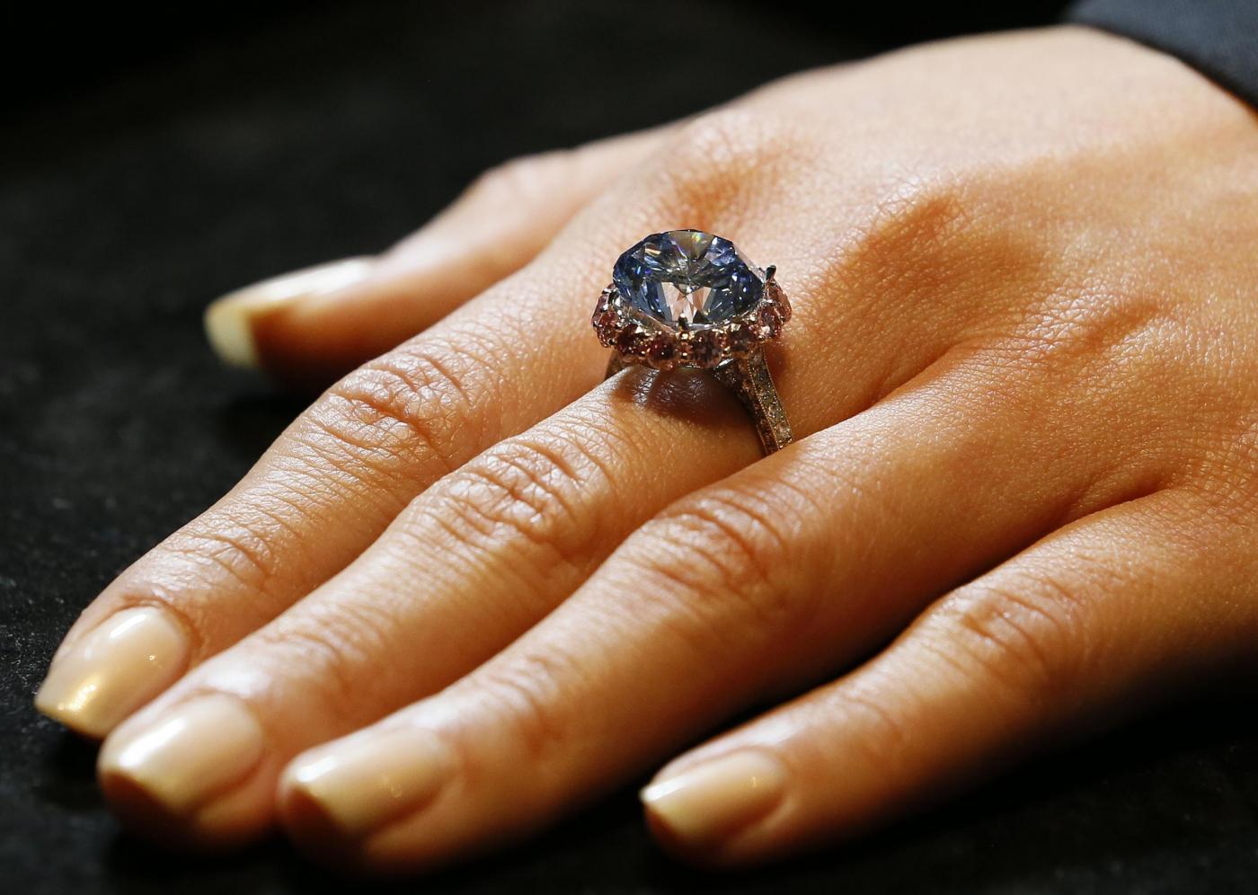 A rare 7.59 carat blue diamond is displayed in a ring setting at a media opportunity at Sotheby's auction rooms in London, Monday, Sept. 9, 2013. The vivid blue diamond is estimated to achieve 12 million pounds ($18.8 million/14.3 million euro) when it is auctioned in the Magnificent Jewels and Jadeite sale on Oct. 7 in Hong Kong. (AP Photo/Kirsty Wigglesworth)