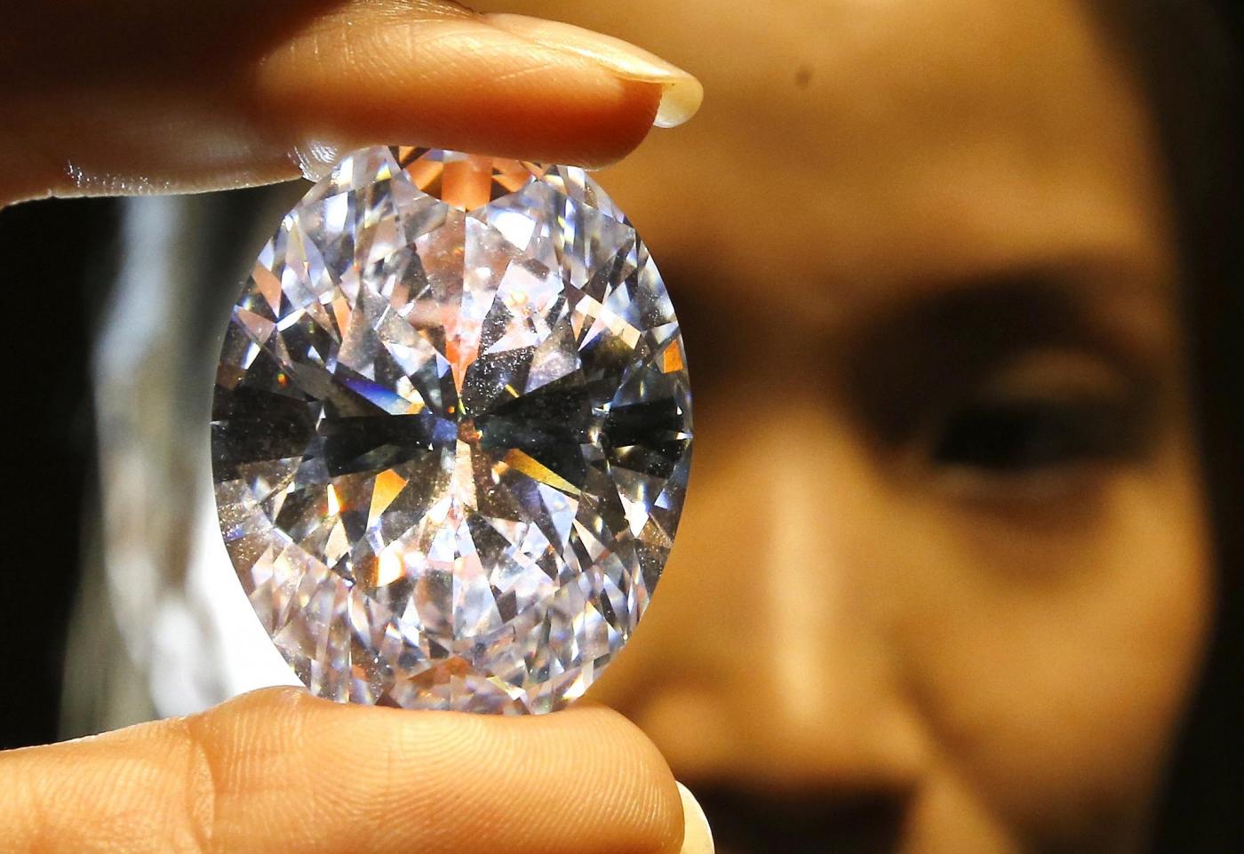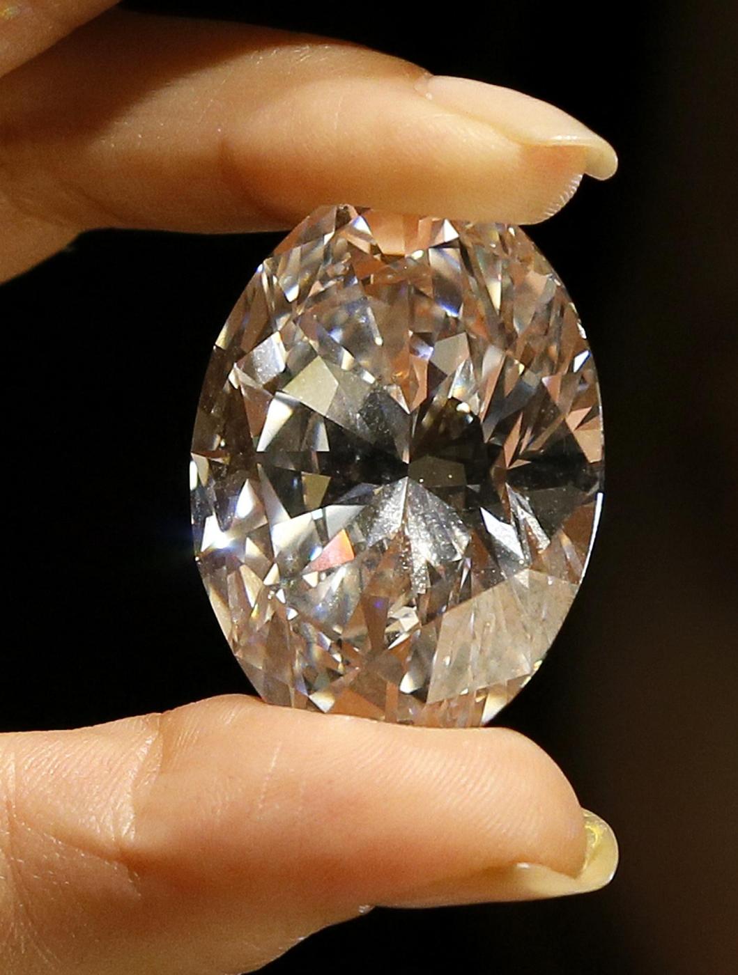 A large diamond is displayed at a media opportunity at Sotheby's auction rooms in London, Monday, Sept. 9, 2013. The oval white diamond is estimated to achieve 17.86 million pounds ($28 million, 21.2 million euro) when it is auctioned in the Magnificent Jewels and Jadeite sale on Oct. 7 in Hong Kong. (AP Photo/Kirsty Wigglesworth)