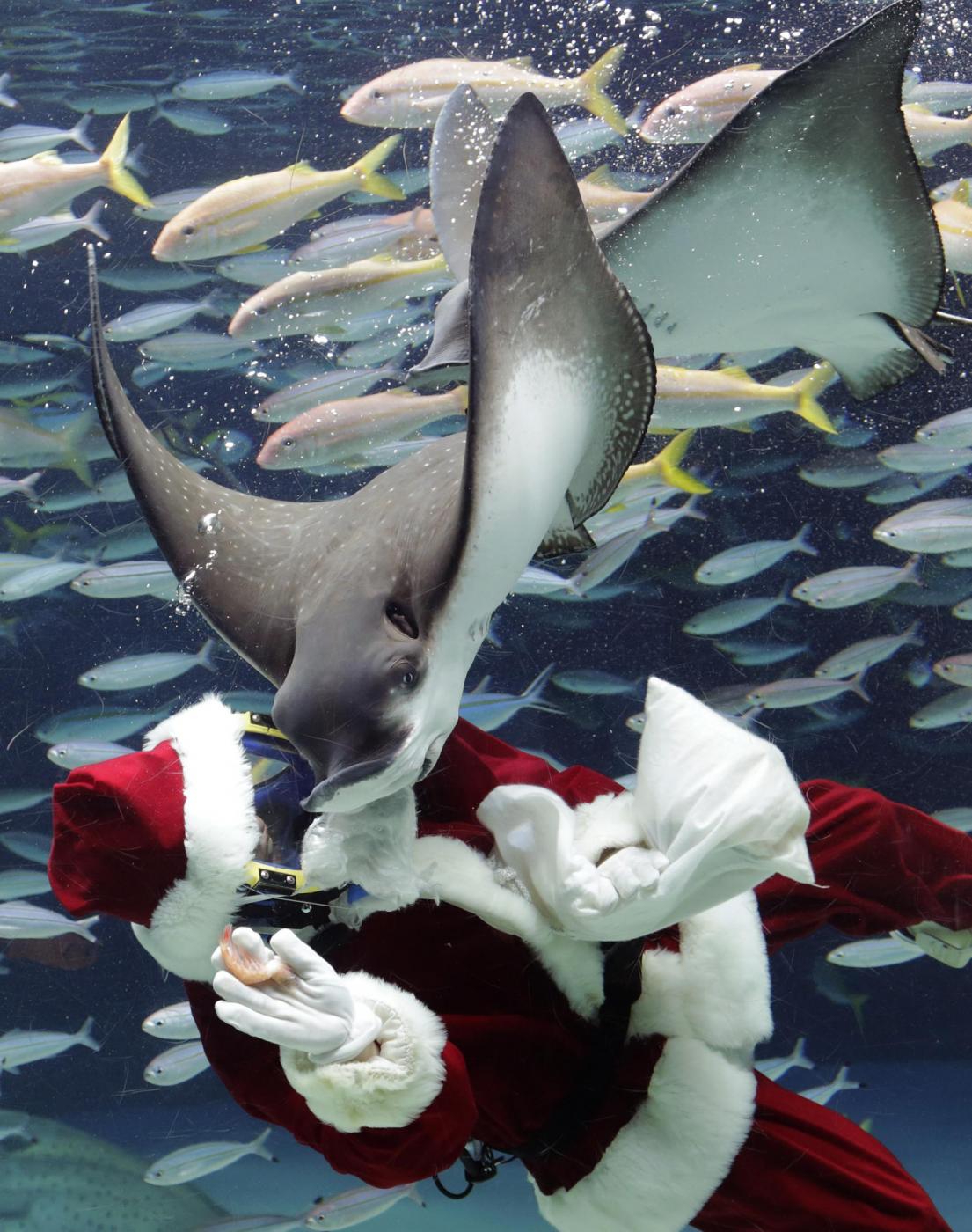 Rays gather around a diver dressed as Santa Claus feeding fish as the annual Christmas attraction starts at Sunshine International Aquarium in Tokyo, Wednesday, Dec. 11, 2013. (AP Photo/Shizuo Kambayashi)