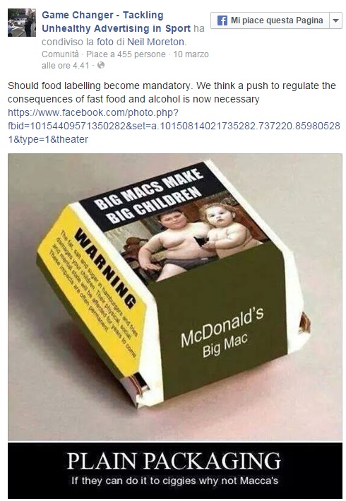 Per lottare contro il cibo spazzatura, quest’uomo ha deciso di stampare foto choc contro l’obesità sulle confezioni che contengono il Big Mac o gli altri hamburger, con sotto lo slogan “BIG MACS MAKE BIG CHILDREN”. La sua pagina Facebook si chiama “Game Changer – Tackling Unhealthy Advertising in Sport”: la foto pubblicata all’interno in poco tempo è diventata virale. La foto raffigura sulla confezione del simbolo del cibo spazzatura, il Big Mac di McDonald’s, si vedono due bambini vestiti di soli indumenti intimi e obesi. Sul lato della confezione del Big Mac c’è un avvertimento sui rischi per la salute provocati dal cibo spazzatura. La foto nasce con lo scopo di avvertire i giovani del rischio del cibo spazzatura, un po’ quello che accade attualmente sui pacchetti delle sigarette.