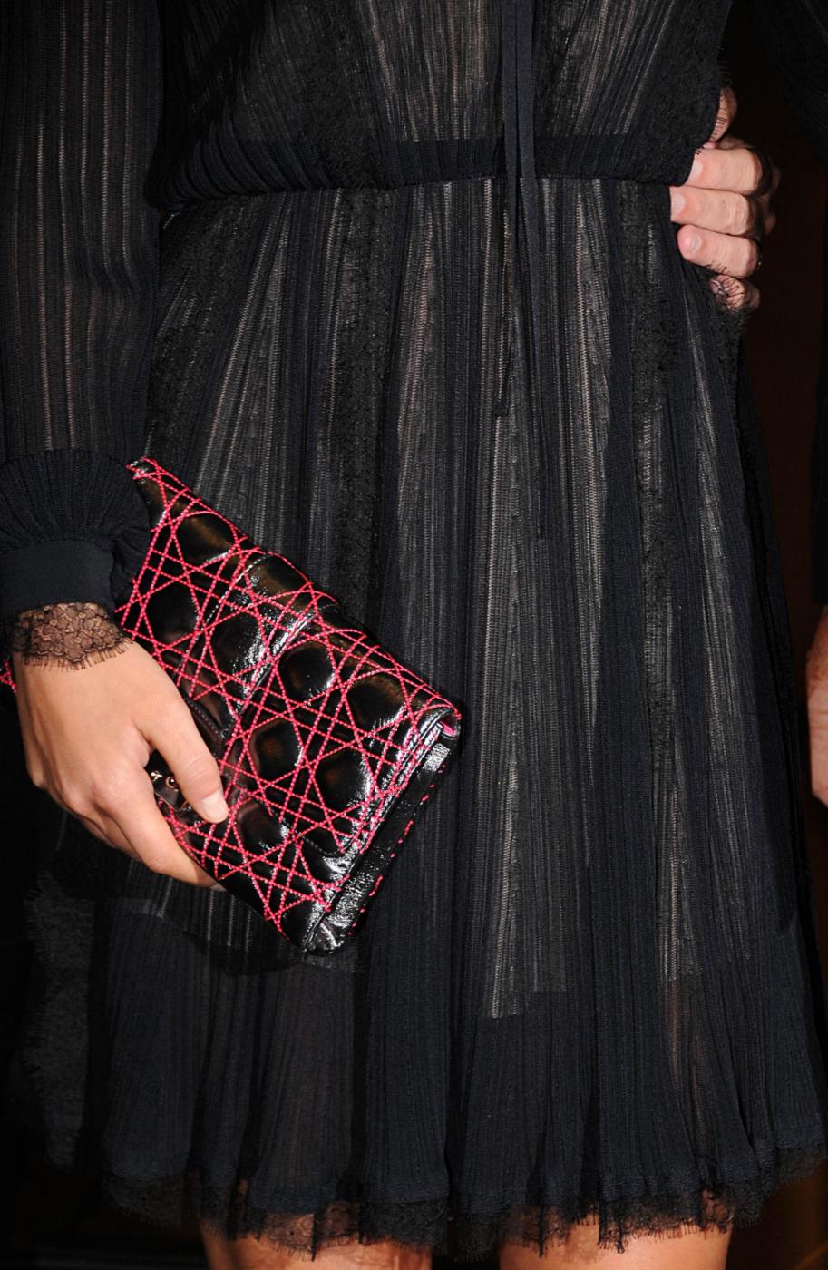 La top model indossava per l’occasione un vestitino nero con leggere trasparenze e una pochette.